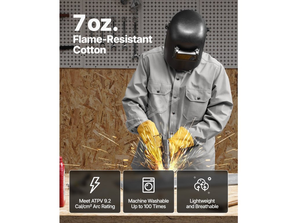 Zostaňte v bezpečí a pohodlí s našou 7 oz. FR čisto bavlnenou zváračskou bundou. Je odolná voči plameňom, priedušná a možno ju prať v práčke, poskytuje spoľahlivú ochranu proti iskrám a plameňom. Vďaka nastaviteľným manžetám, robustným kovovým gombíkom a 2 praktickým vreckám je ideálnym spoločníkom pri zváraní.