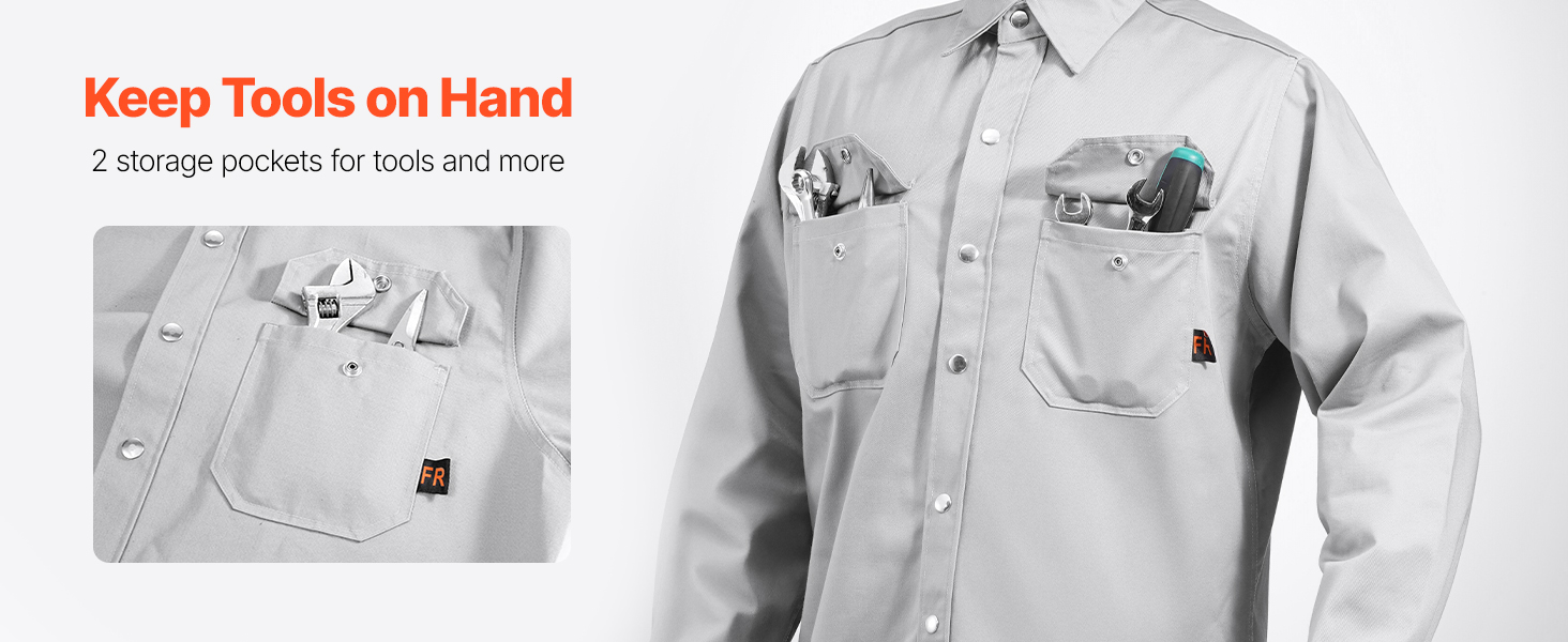 Naša žiaruvzdorná bunda vybavená 2 vreckami poskytuje úložný priestor pre vaše základné nástroje a osobné veci, čím zabezpečuje ich bezpečnosť a ľahký prístup a udržuje vás pripravených na danú úlohu.