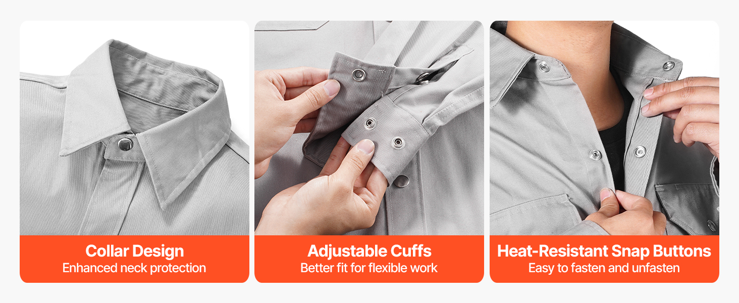 Premyslene navrhnutý golier poskytuje zvýšenú ochranu krku pre väčšiu bezpečnosť. Nastaviteľné manžety ponúkajú lepšie prispôsobenie, čo umožňuje väčšiu flexibilitu počas práce. Vďaka robustným kovovým gombíkom sa zváračská bezpečnostná bunda ľahko oblieka a vyzlieka.