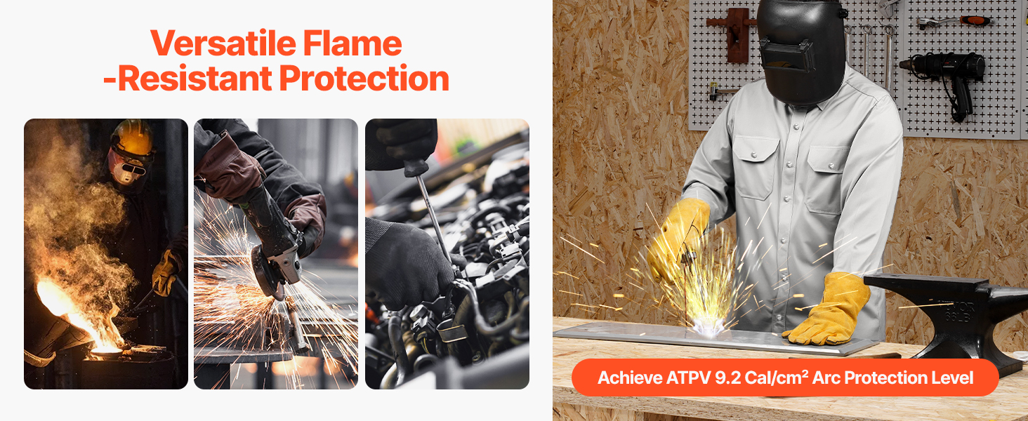Táto všestranná bavlnená zváračská bunda odolná voči plameňom ponúka výnimočnú ochranu, dosahuje úroveň ochrany proti oblúku ATPV 9,2 Cal/cm², čím účinne odoláva vysokým teplotám a plameňom.