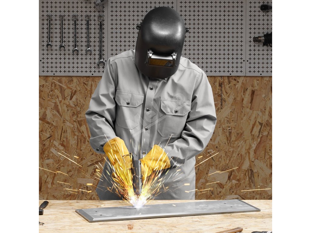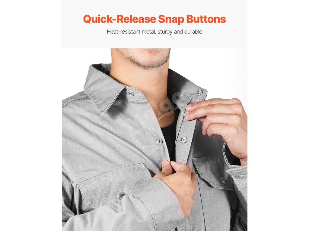 Premyslene navrhnutý golier poskytuje zvýšenú ochranu krku pre väčšiu bezpečnosť. Nastaviteľné manžety ponúkajú lepšie prispôsobenie, čo umožňuje väčšiu flexibilitu počas práce. Vďaka robustným kovovým gombíkom sa zváračská bezpečnostná bunda ľahko oblieka a vyzlieka.