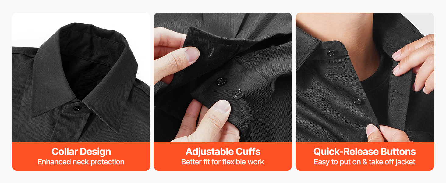 Premyslene navrhnutý golier poskytuje zvýšenú ochranu krku pre väčšiu bezpečnosť. Nastaviteľné manžety ponúkajú lepšie prispôsobenie, čo umožňuje väčšiu flexibilitu počas práce. Vďaka rýchloupínacím plastovým gombíkom sa zváračská bezpečnostná bunda ľahko oblieka a vyzlieka.