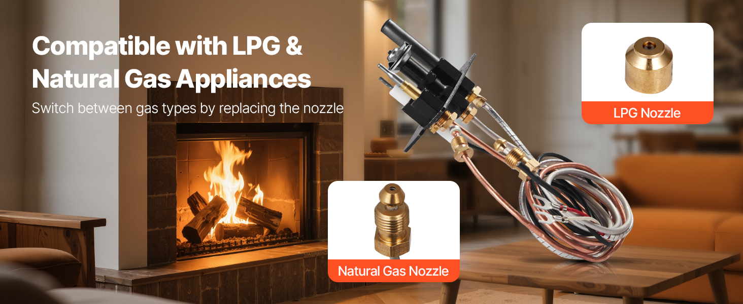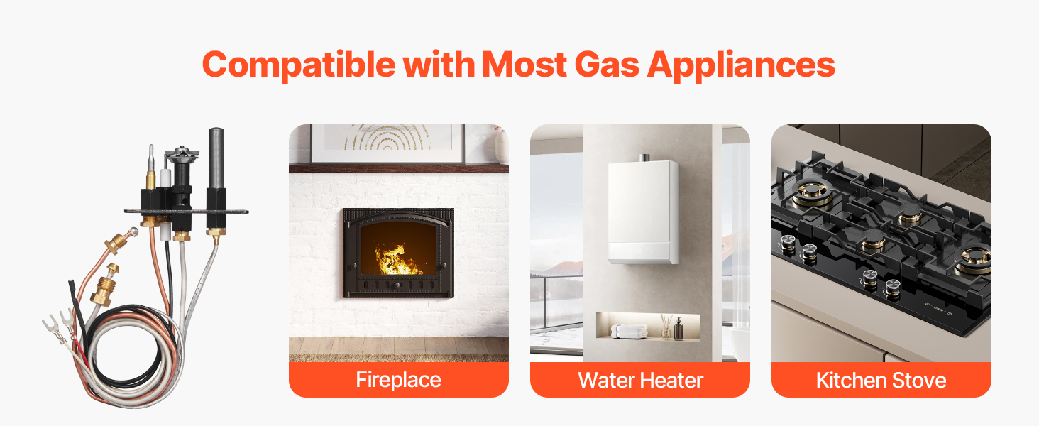 Táto zostava plynového pilotného zapaľovania je kompatibilná s väčšinou bežných krbov na trhu. Hodí sa aj na domáce ohrievače vody a kuchynské sporáky, čím ľahko spĺňa potreby zapaľovania rôznych plynových spotrebičov.
