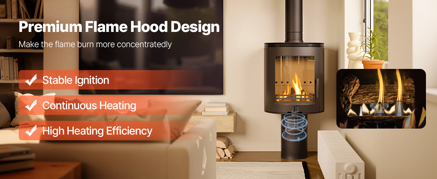 Naša plynová pilotná zostava krbu má prémiovú konštrukciu krytu plameňa, vďaka ktorej výkonný plameň horí stabilnejšie a realizuje rýchle a úplné spaľovanie. Stabilný plameň nepretržite dodáva vysokú tepelnú energiu, čím výrazne zvyšuje účinnosť vykurovania.