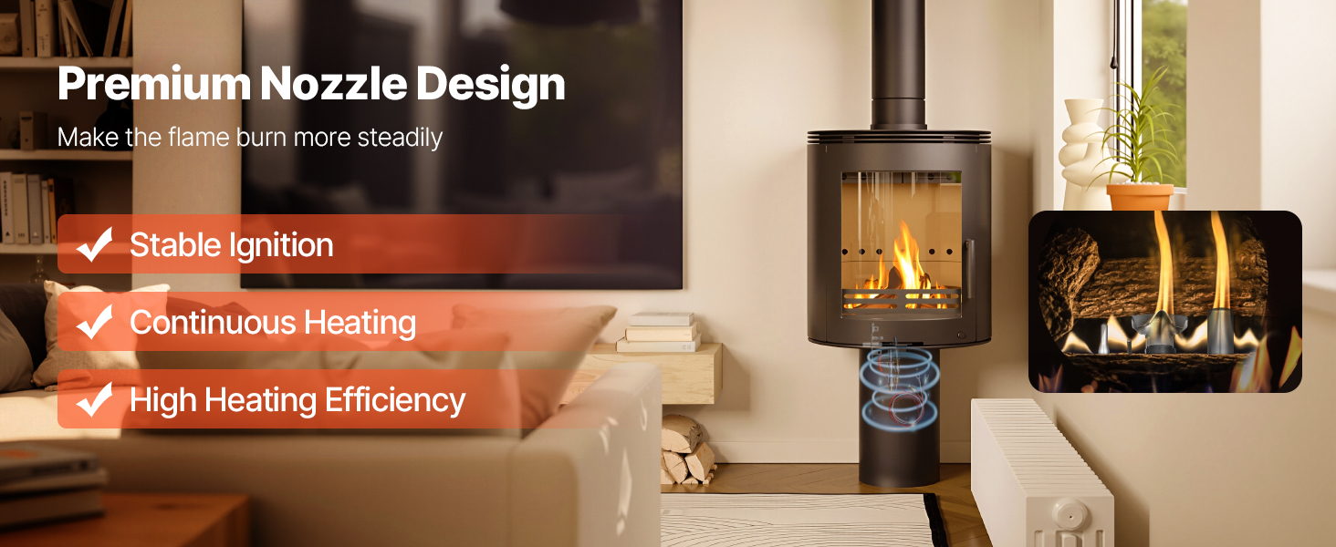 Naša plynová pilotná zostava krbu má prémiovú konštrukciu trysky, vďaka ktorej výkonný plameň horí stabilnejšie a realizuje rýchle a úplné spaľovanie. Stabilný plameň nepretržite dodáva vysokú tepelnú energiu, čím výrazne zvyšuje účinnosť vykurovania.
