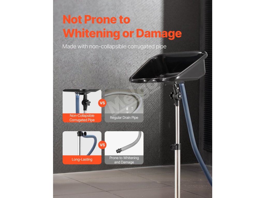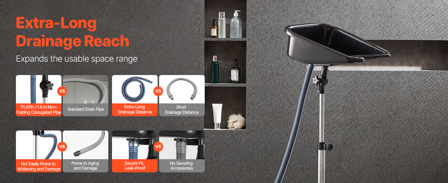 Prenosné salónne umývadlo sa dodáva s predĺženou nezhrňovanou vlnitou rúrou s dĺžkou 70,87 palca/1,8 m, ktorá je tiež odolná a nie je náchylná na vybielenie alebo poškodenie. Toto predĺženie zväčšuje rozsah odtoku a poskytuje väčšiu flexibilitu pre vaše potreby odtoku.