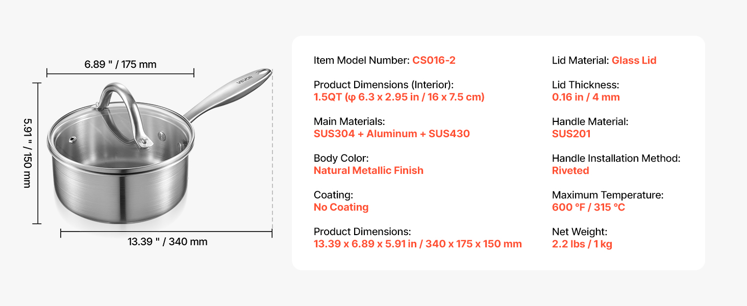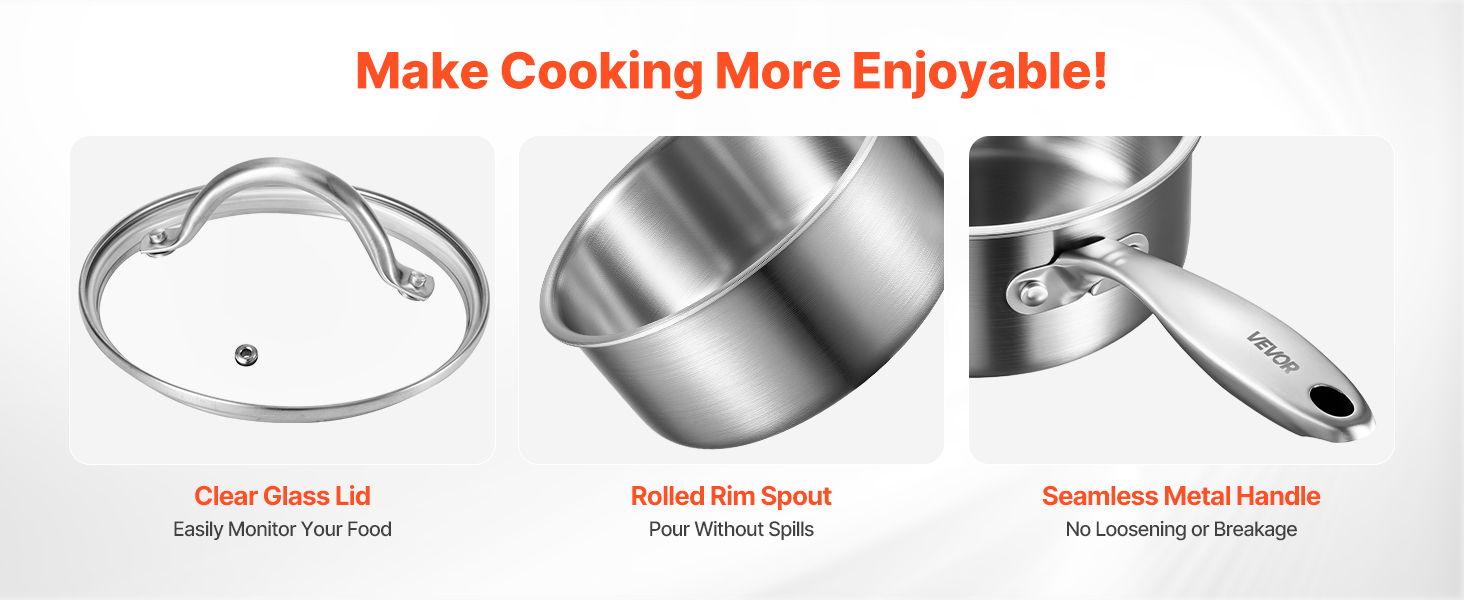 Naša nerezová panvica na omáčku sa dodáva s pokrievkou zo zhrubnutého priehľadného skla na sledovanie priebehu varenia. Rozšírený okraj umožňuje vylievanie polievky a mlieka bez kvapkania. Nitovaná jednodielna kovová rukoväť zaručuje odolnosť a zabraňuje uvoľneniu alebo zlomeniu počas používania.