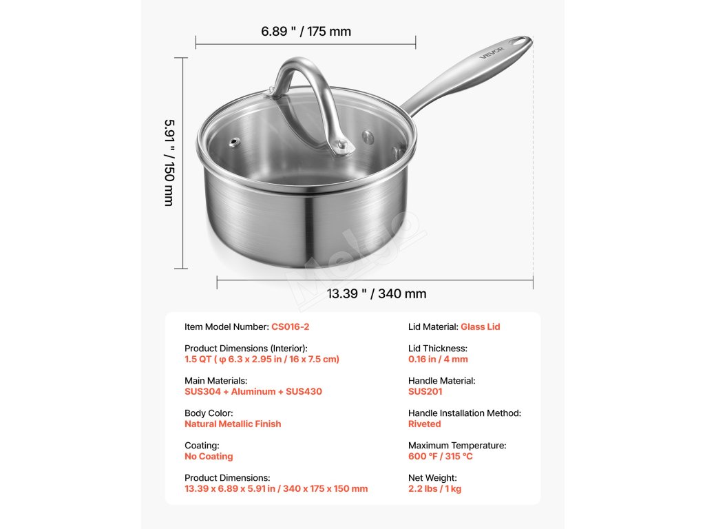 Naša nerezová panvica na omáčku sa dodáva s pokrievkou zo zhrubnutého priehľadného skla na sledovanie priebehu varenia. Rozšírený okraj umožňuje vylievanie polievky a mlieka bez kvapkania. Nitovaná jednodielna kovová rukoväť zaručuje odolnosť a zabraňuje uvoľneniu alebo zlomeniu počas používania.