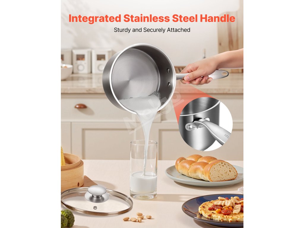 Naša nerezová panvica na omáčku sa dodáva s pokrievkou zo zhrubnutého priehľadného skla na sledovanie priebehu varenia. Rozšírený okraj umožňuje vylievanie polievky a mlieka bez kvapkania. Nitovaná jednodielna kovová rukoväť zaručuje odolnosť a zabraňuje uvoľneniu alebo zlomeniu počas používania.