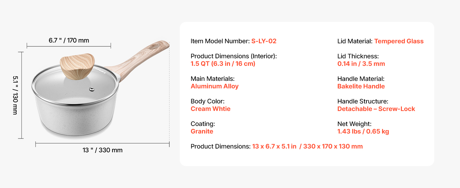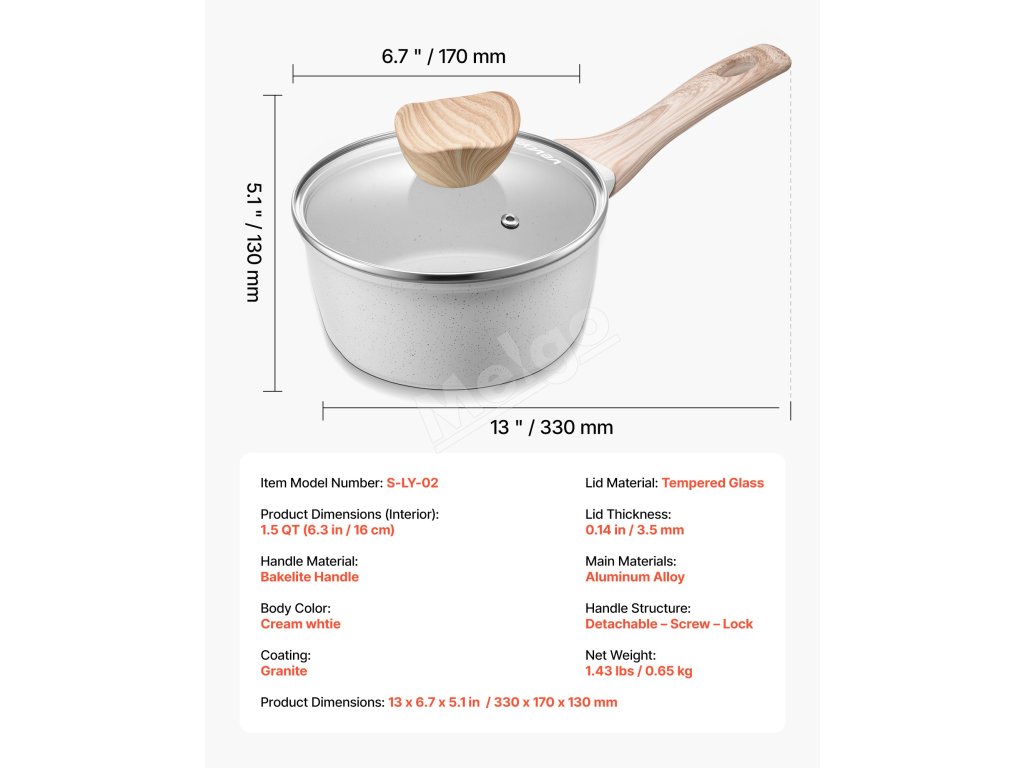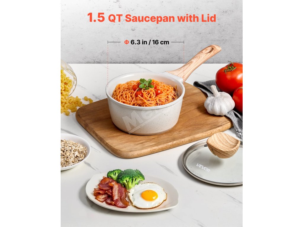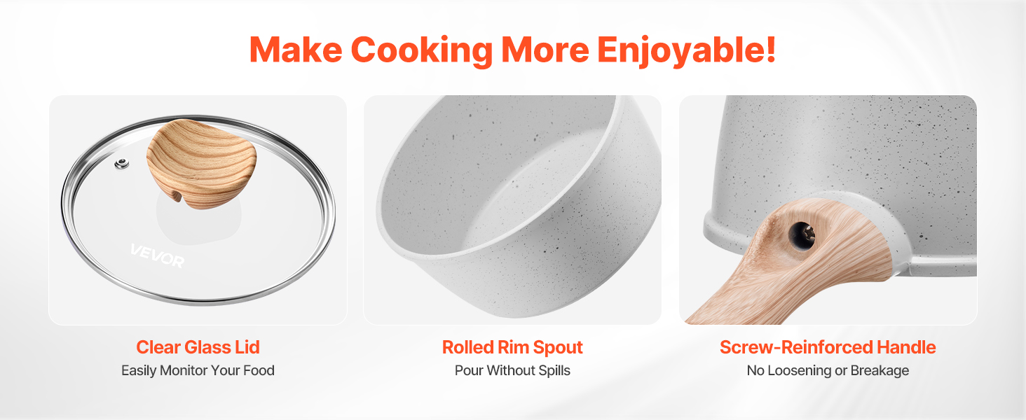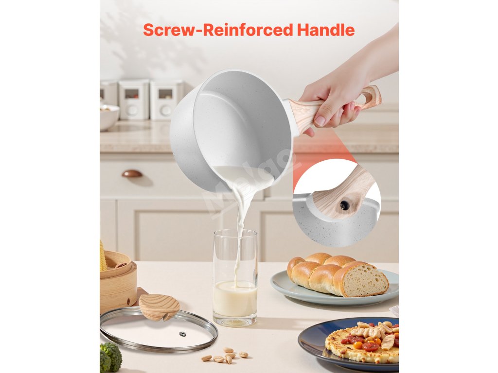 Hrniec s nepriľnavým povrchom sa dodáva so zosilnenou priehľadnou sklenenou pokrievkou na jednoduchú kontrolu, rozšíreným okrajom na nalievanie polievky alebo mlieka bez odkvapkávania a zosilnenou rukoväťou upevnenou skrutkami na zvýšenie stability. Rukoväť sa ľahko inštaluje a je vyrobená tak, aby vydržala.