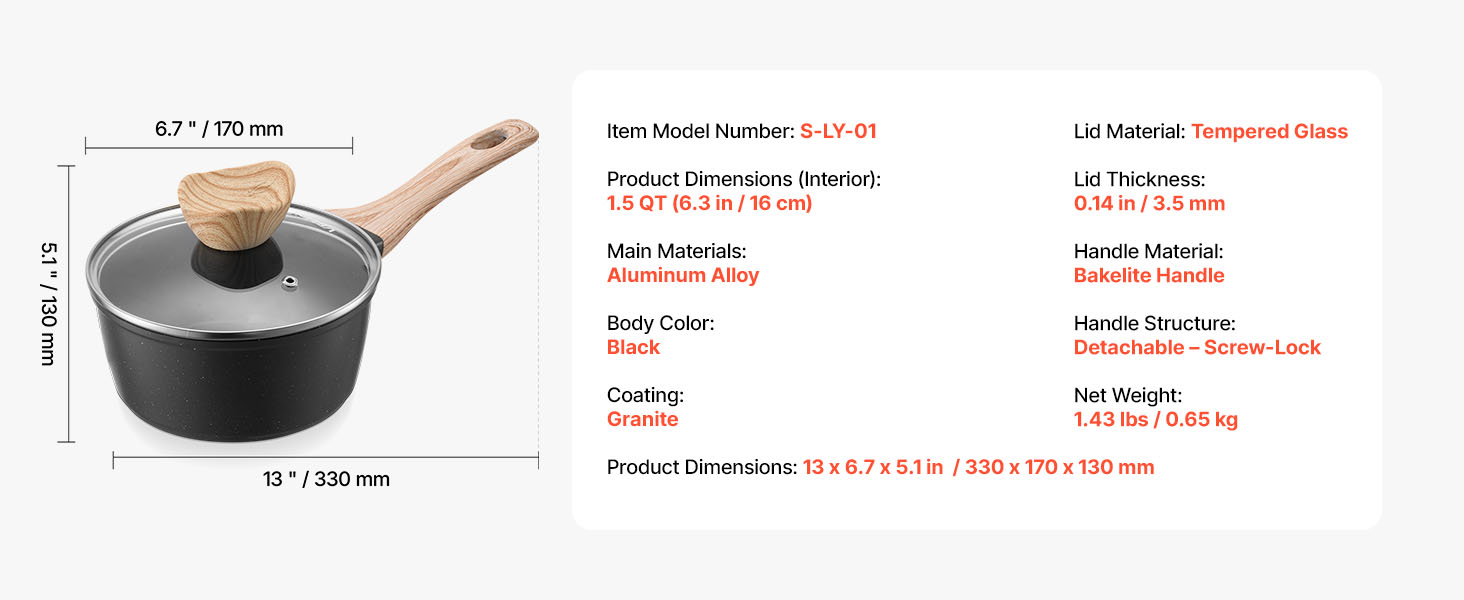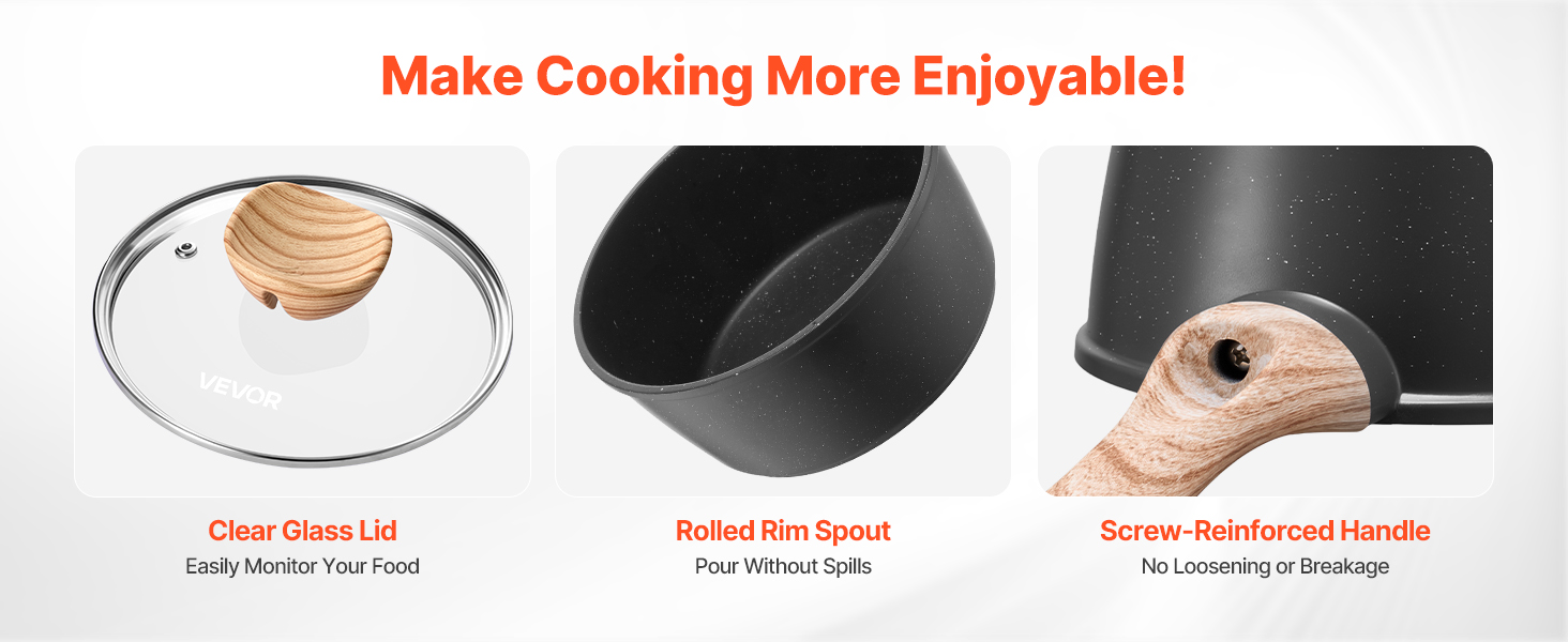 Hrniec s nepriľnavým povrchom sa dodáva so zosilnenou priehľadnou sklenenou pokrievkou na jednoduchú kontrolu, rozšíreným okrajom na nalievanie polievky alebo mlieka bez odkvapkávania a zosilnenou rukoväťou upevnenou skrutkami na zvýšenie stability. Rukoväť sa ľahko inštaluje a je vyrobená tak, aby vydržala.