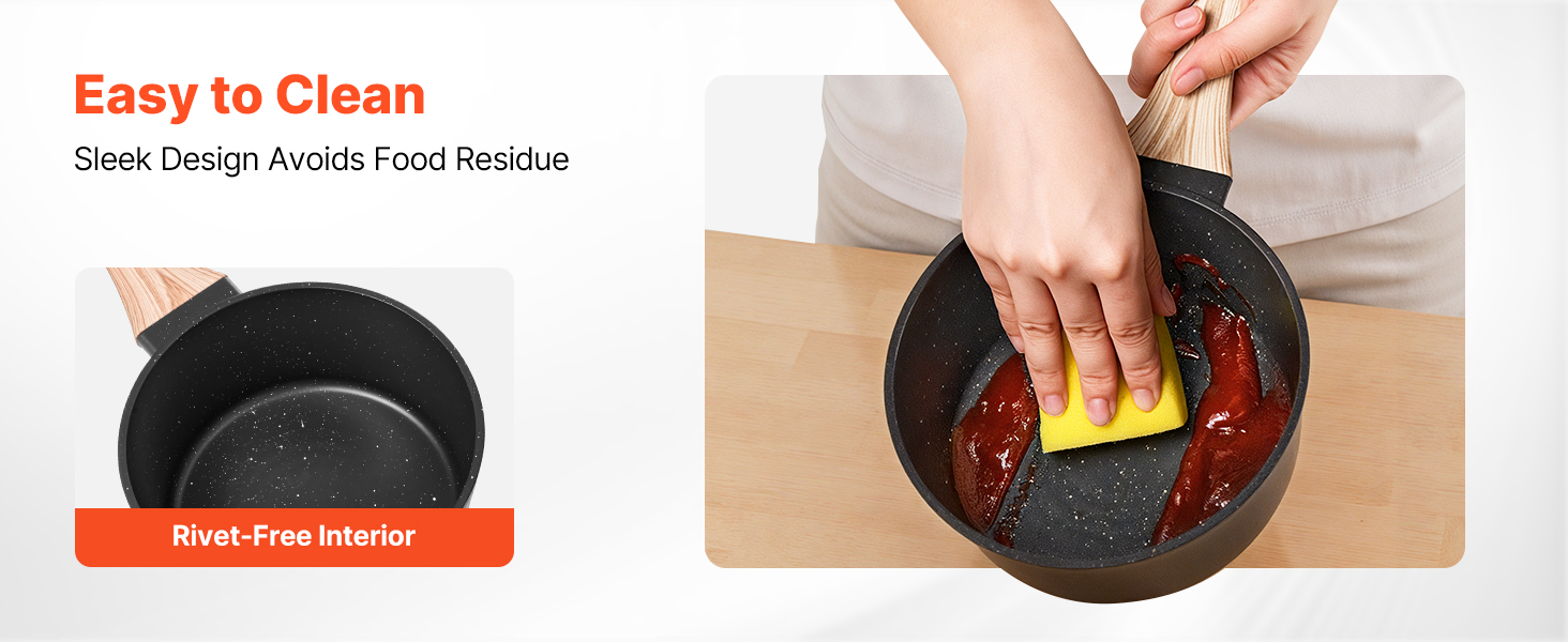 Náš hrniec na omáčku je vybavený mramorovým nepriľnavým povrchom, ktorý umožňuje rovnomerné varenie jedla bez pripaľovania - aj s minimálnym množstvom oleja. Ideálny na bezpečné varenie, vďaka ktorému bude každé jedlo chutné.