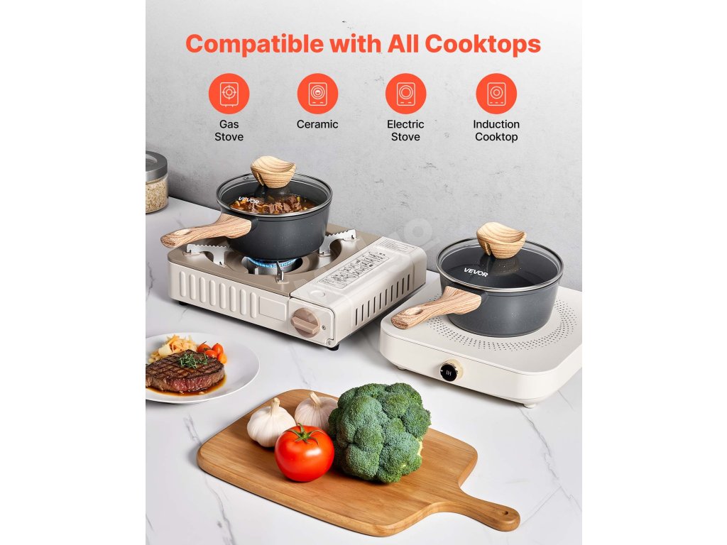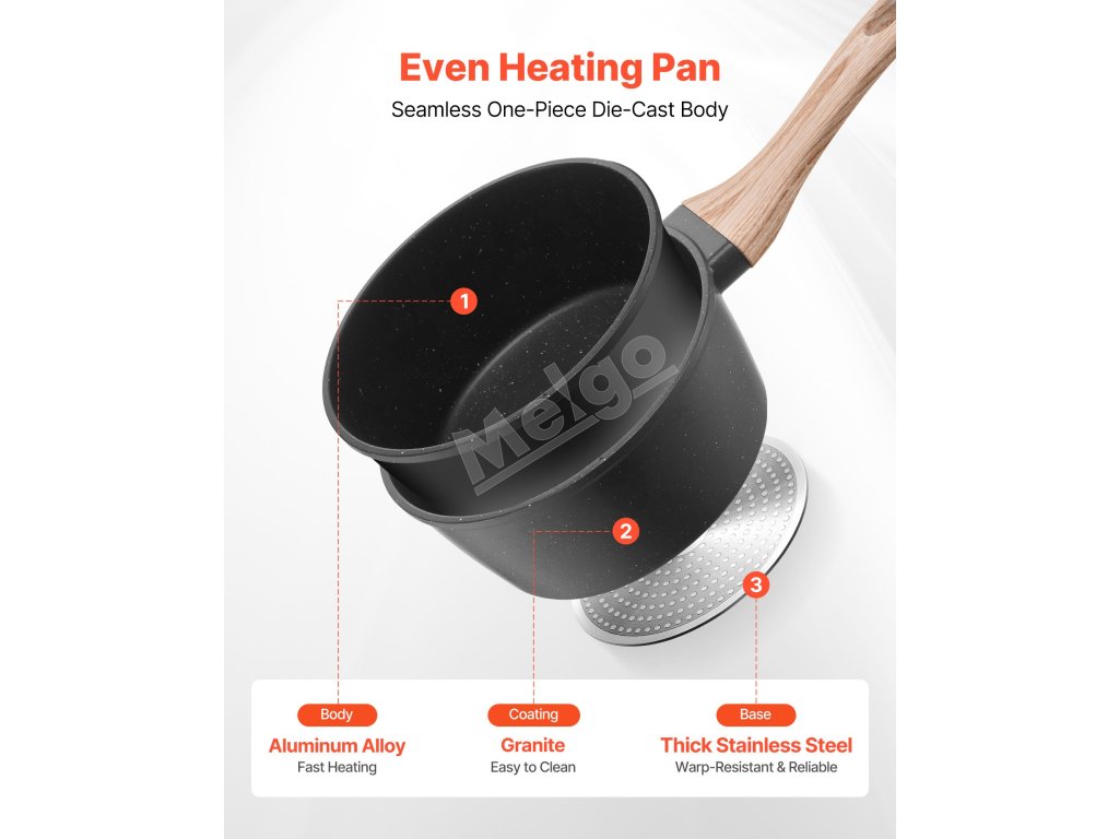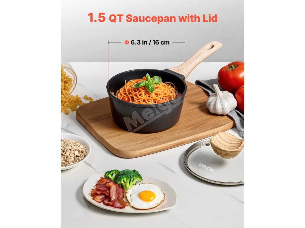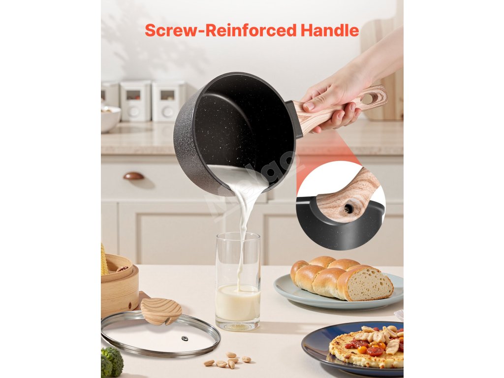 Hrniec s nepriľnavým povrchom sa dodáva so zosilnenou priehľadnou sklenenou pokrievkou na jednoduchú kontrolu, rozšíreným okrajom na nalievanie polievky alebo mlieka bez odkvapkávania a zosilnenou rukoväťou upevnenou skrutkami na zvýšenie stability. Rukoväť sa ľahko inštaluje a je vyrobená tak, aby vydržala.