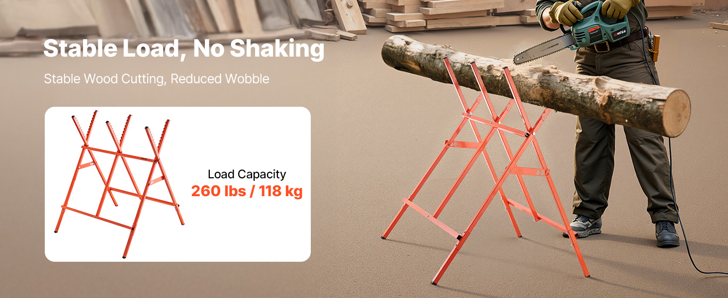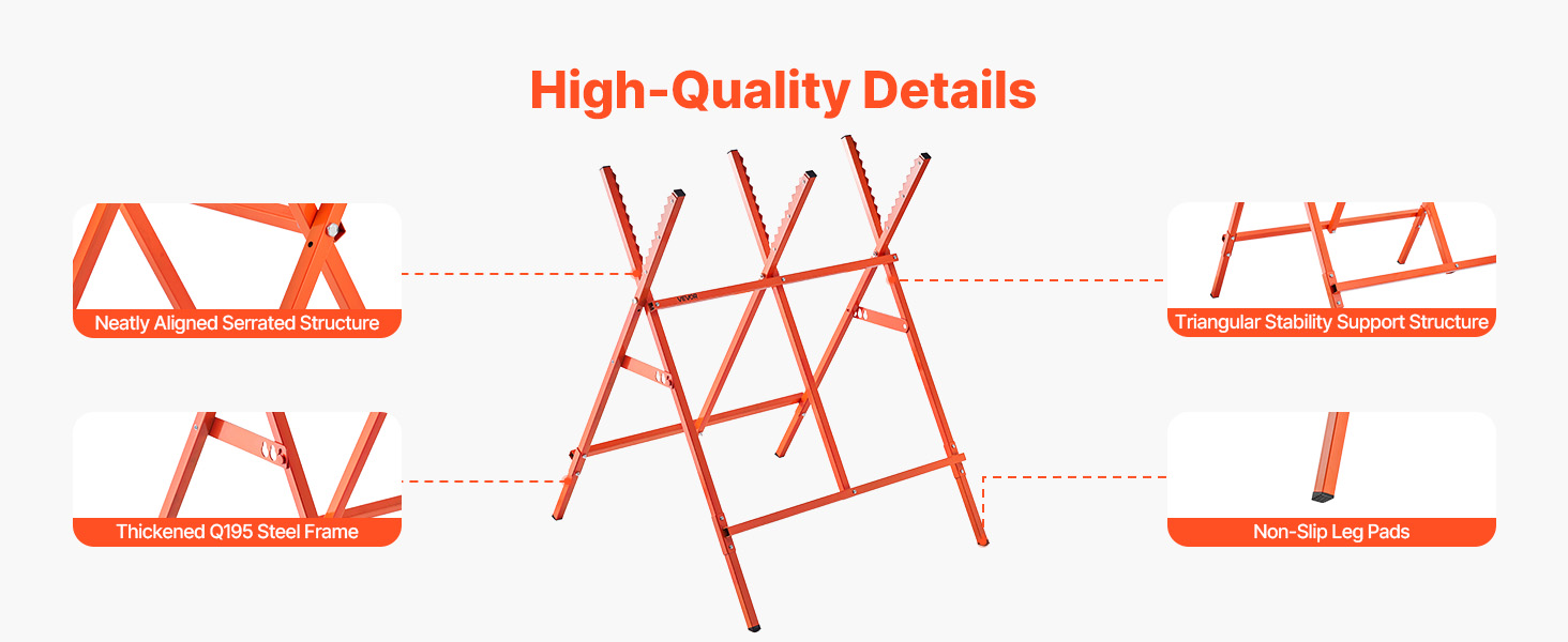Modely prenosných pílových koníkov s vysokou odolnosťou sú vyrobené z pevnej prvotriednej ocele. Podporné nohy stačí uzamknúť na mieste, aby sa dosiahla vzpriamená prevádzka a stabilná podpora hmotnosti bez kývania.
