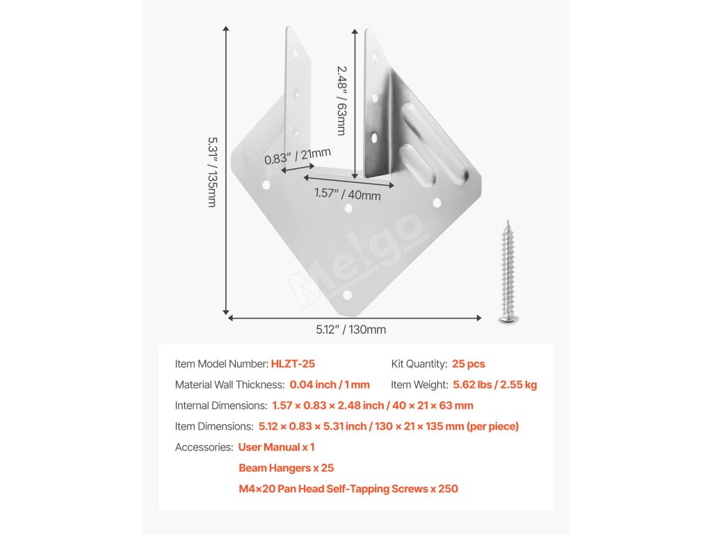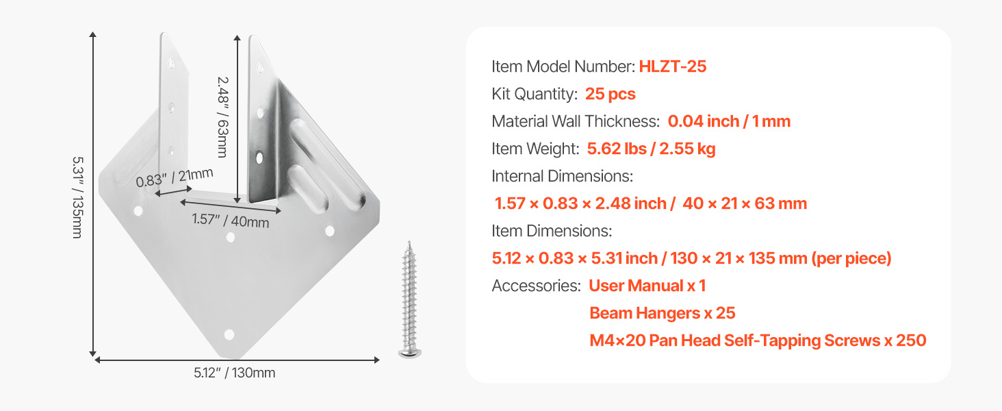 Naše závesy na trámy vyrobené z robustnej ocele s veľkou nosnosťou a odolnosťou voči poveternostným vplyvom poskytujú silnú oporu pre stavby na záhrade, detskom ihrisku a na dvore. Inštalácia je jednoduchá s kompletným hardvérom, ideálna pre domácich majstrov. Hodia sa na väčšinu reziva s rozmermi 5,31 × 1,57 palca a dobre fungujú na strechy, trámy, rámy a stĺpy.