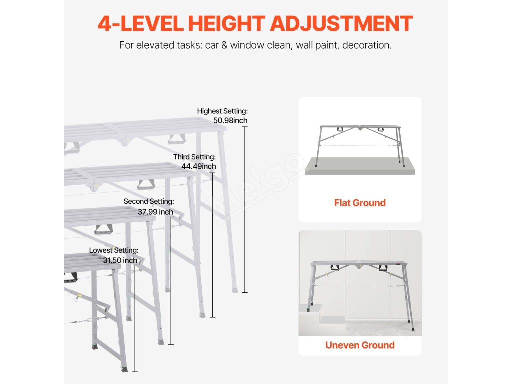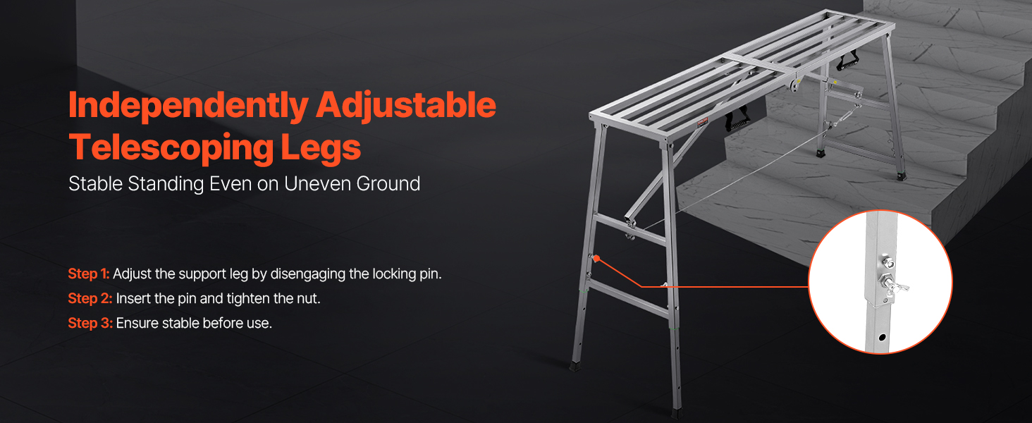 Vďaka individuálne nastaviteľným teleskopickým nohám môžete ľahko prispôsobiť výšku tak, aby vyhovovala akémukoľvek pracovnému povrchu, a to aj na nerovnom teréne. Táto prispôsobivosť umožňuje vždy pevné a bezpečné nastavenie.