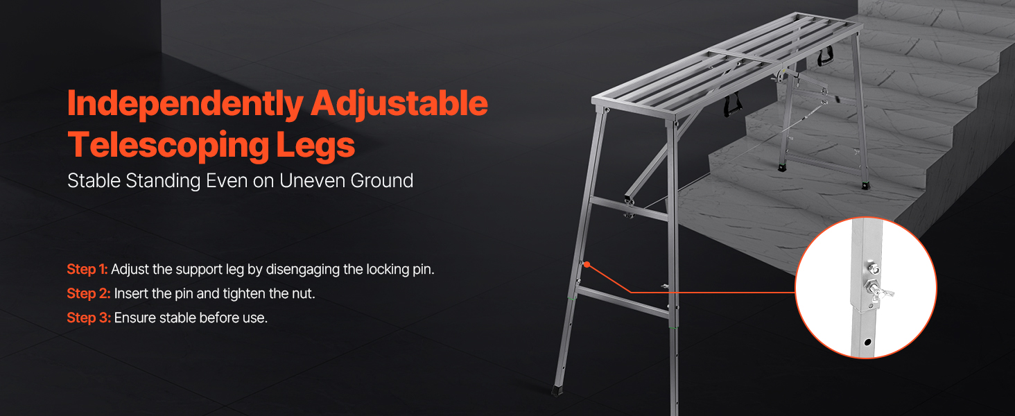 Vďaka individuálne nastaviteľným teleskopickým nohám môžete ľahko prispôsobiť výšku tak, aby vyhovovala akémukoľvek pracovnému povrchu, a to aj na nerovnom teréne. Táto prispôsobivosť umožňuje vždy pevné a bezpečné nastavenie.