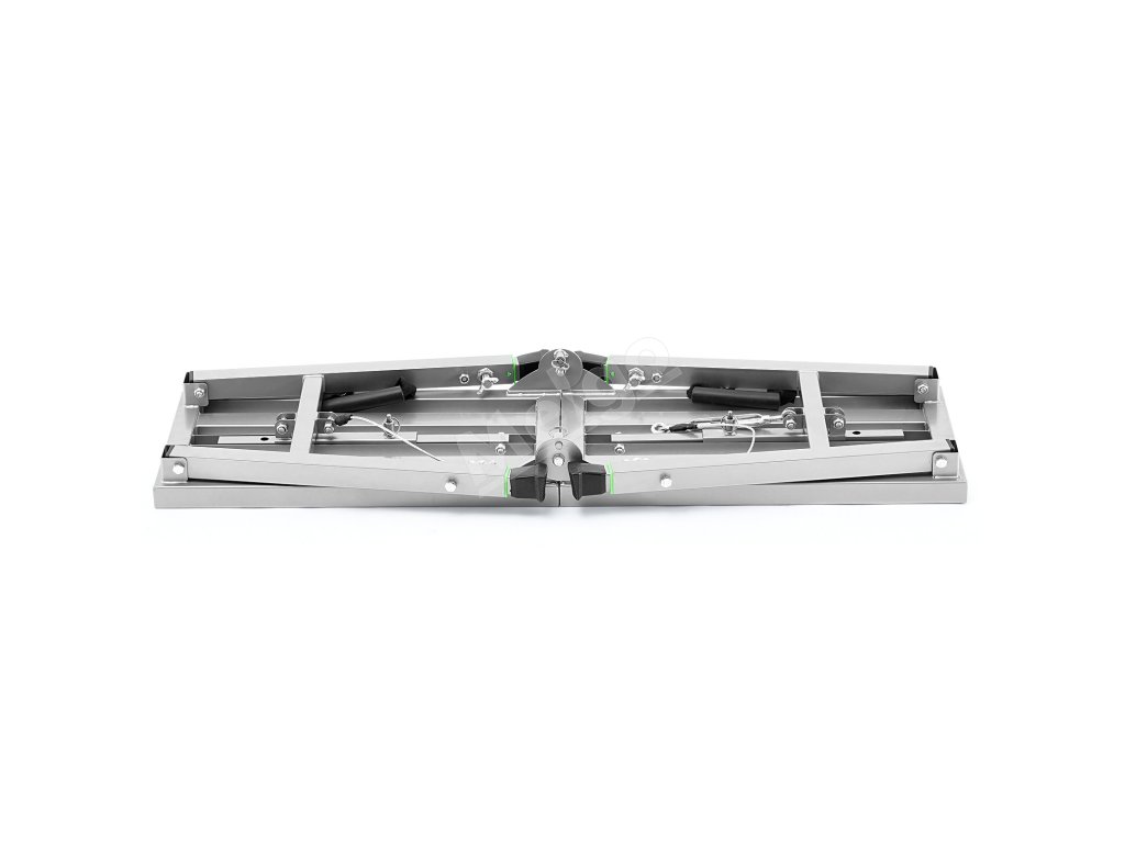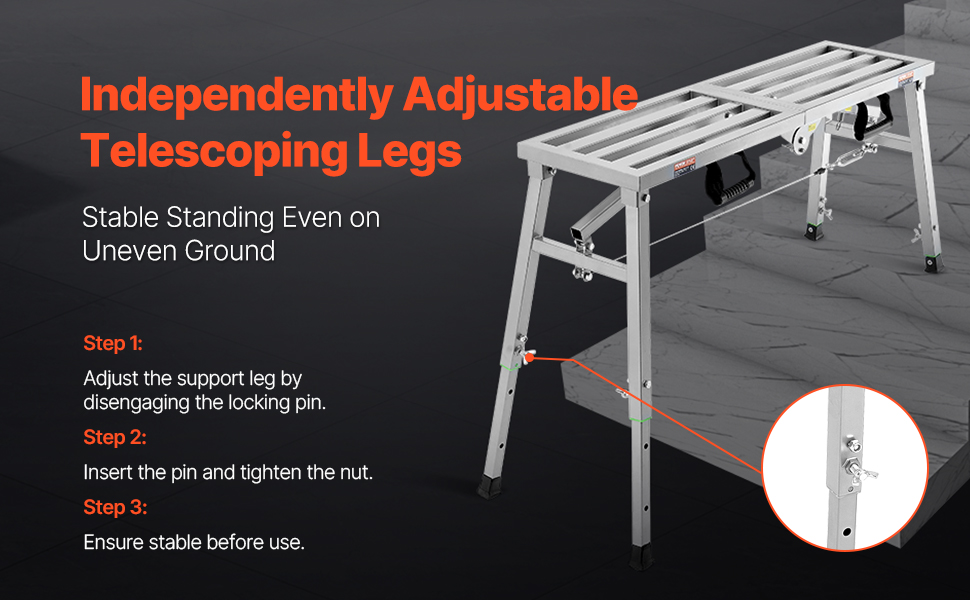 Vďaka individuálne nastaviteľným teleskopickým nohám môžete ľahko prispôsobiť výšku tak, aby vyhovovala akémukoľvek pracovnému povrchu, a to aj na nerovnom teréne. Táto prispôsobivosť umožňuje vždy pevné a bezpečné nastavenie.