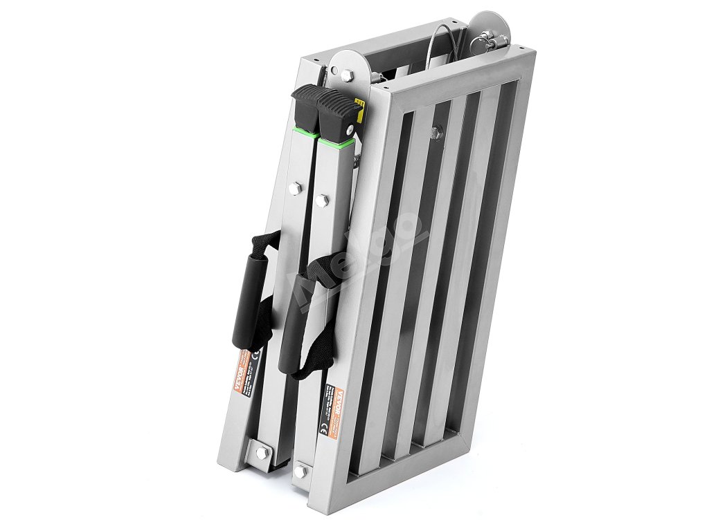 Toto prenosné lešenie zjednodušuje prácu vo výškach vďaka rýchlemu zloženiu/rozloženiu. Je stabilné vďaka viacuholníkovej konštrukcii a využíva pozinkované oceľové rúrky s vysokou tvrdosťou 1,2 mm. Jeho štyri nastaviteľné nohy sa prispôsobia nerovnému terénu a zároveň poskytujú pevnú oporu.