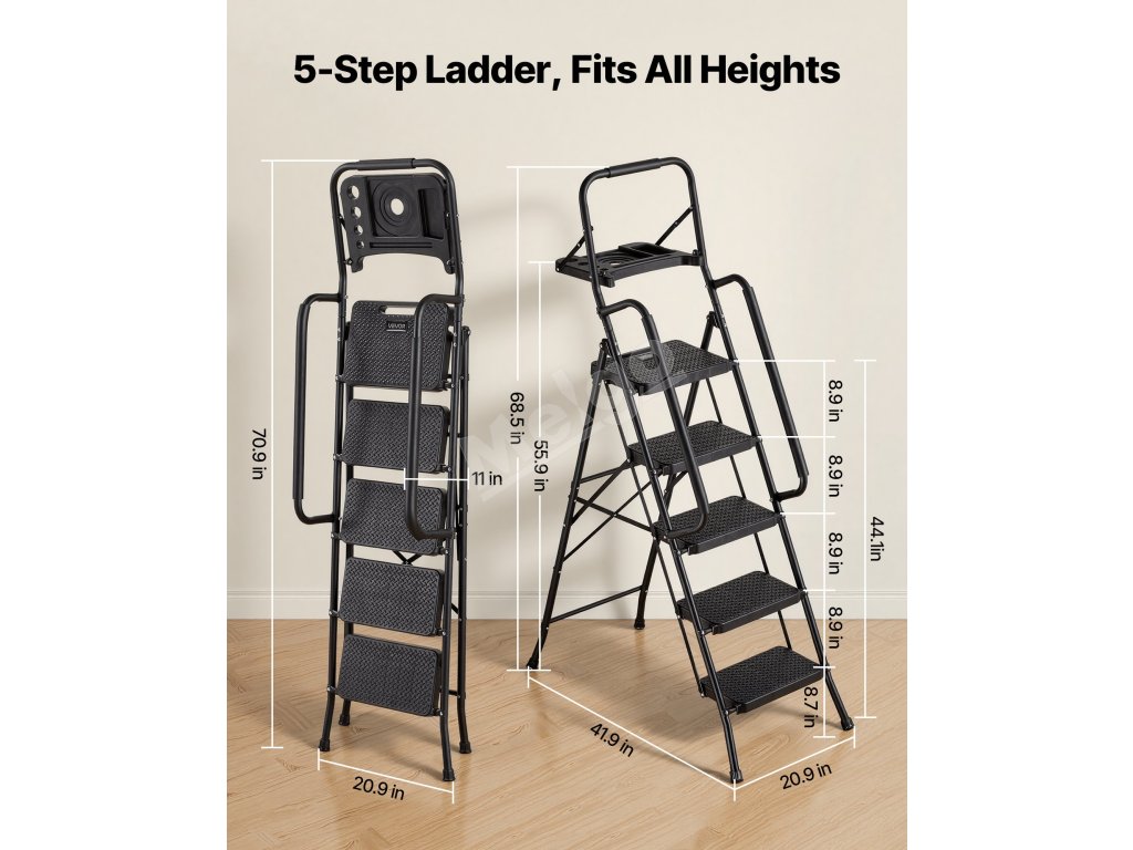 Skladací 5-stupňový schodík, nosnosť 272 kg, protišmykové stupne