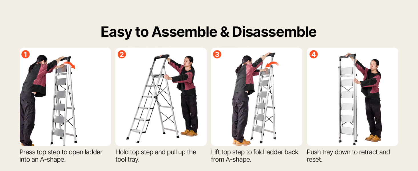 Tento skladací rebrík sa ľahko otvára jedným stlačením hornej priečky, ktorá sa zamyká, s hladkým a bezproblémovým ovládaním, bez zložitého nastavovania, skladá sa do tenkého tvaru na skladovanie, keď sa nepoužíva, a je ideálny pre každodenné použitie v domácnosti.