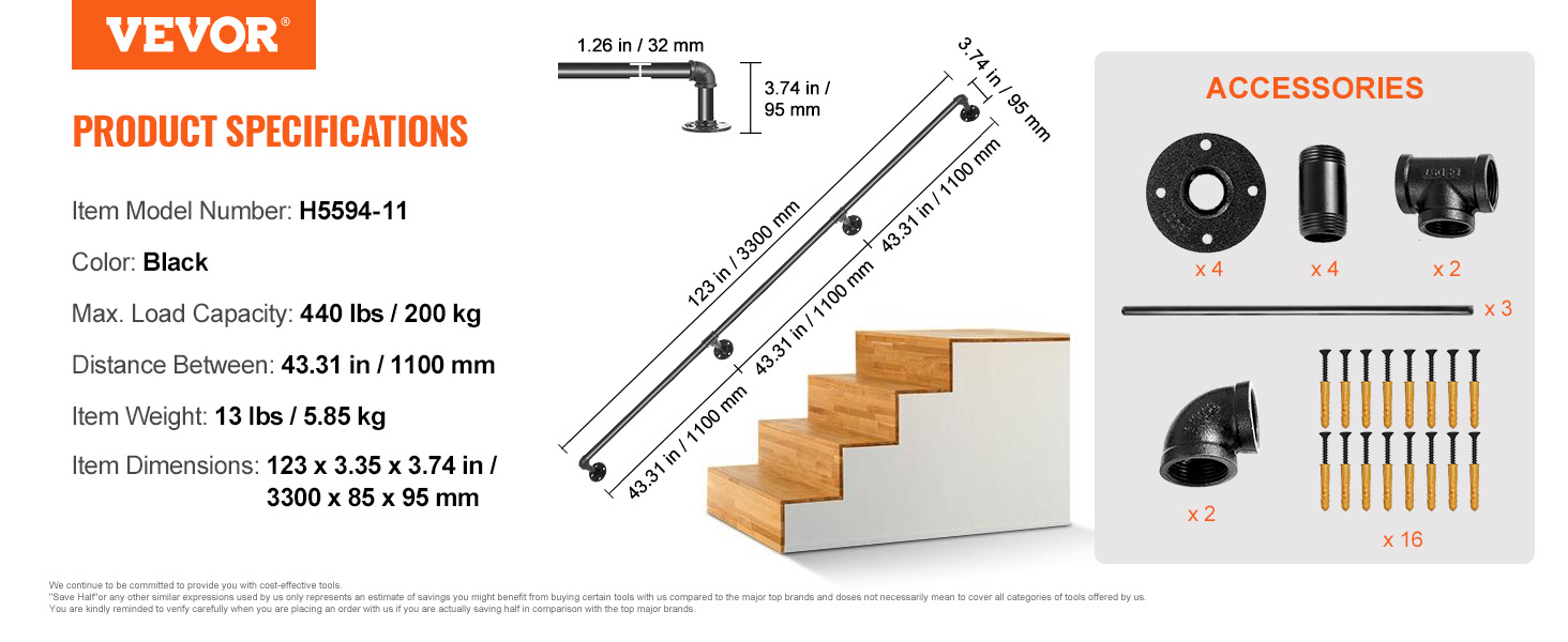 Zábradlie na schodisko 335.3 cm, 199.6 kg, uhlíková oceľ, nástenné