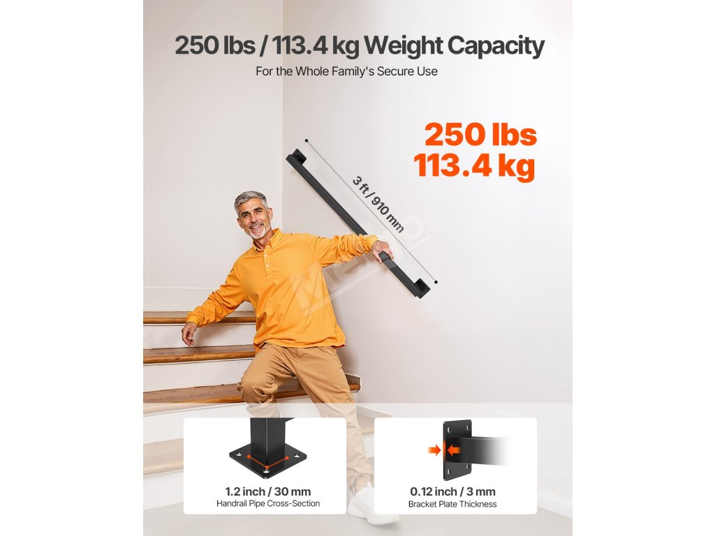 Nástenné madlo na schody, 1215mm, čierna oceľ, nosnosť 113kg, 2 diely