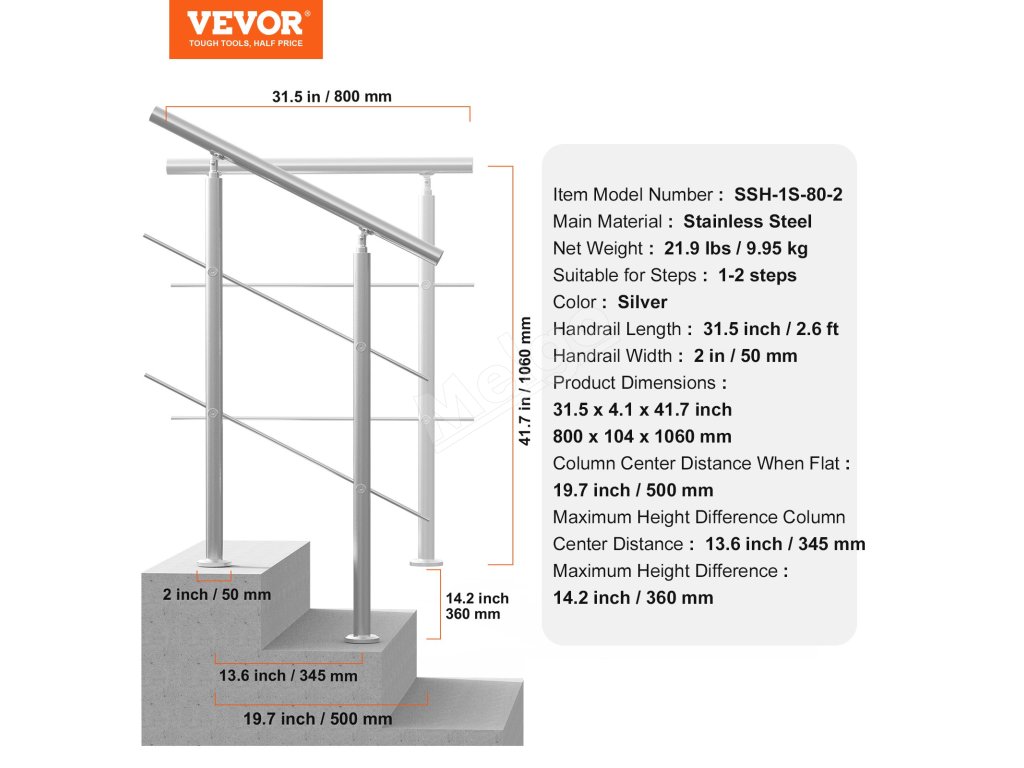 Zábradlie na schody, dĺžka 31.5in, 2 priečky, nerez, s montážnou sadou