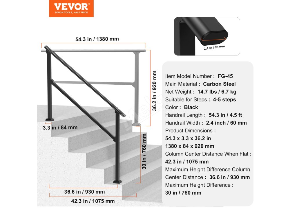 | Šírka zábradlia | 2.4 palce / 60 mm |