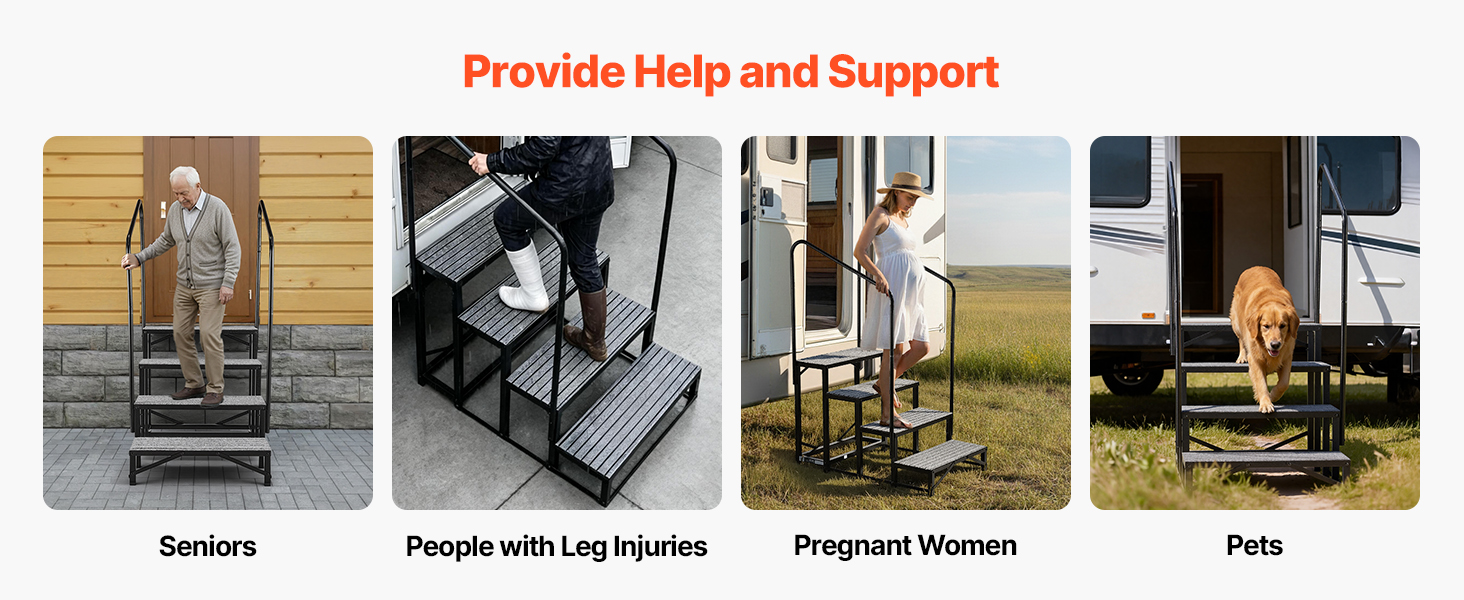 Fungujú ako schody do karavanu, schody do vírivky, schody do domu a schody do bazéna. Pomáhajú seniorom, ľuďom s poraneniami kolien, tehotným ženám a deťom ľahko stúpať a schádzať po schodoch.