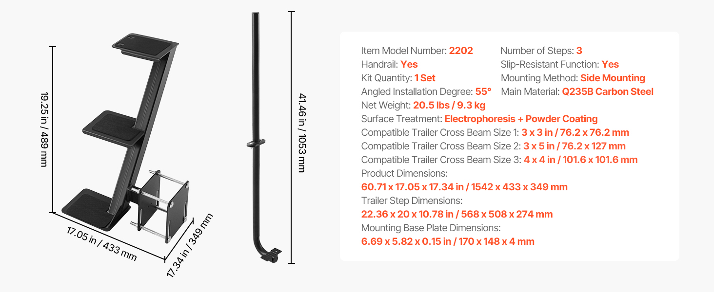 Základňa podporuje ľavú, strednú a pravú montážnu polohu a je kompatibilná s priečnymi nosníkmi prívesu s rozmermi 3 x 3 palce (76,2 x 76,2 mm), 3 x 5 palcov (76,2 x 127 mm) a 4 x 4 palce (101,6 x 101,6 mm). Schody na príves pre člny s madlom sa hodia na väčšinu bežných konfigurácií prívesov.