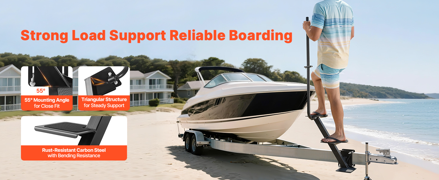 Inštalačný uhol 55° a trojuholníková konštrukcia zaisťujú stabilitu a žiadne kolísanie, zatiaľ čo uhlíková oceľ odolná proti korózii zaisťuje dlhodobú a spoľahlivú nosnosť. Tieto schody na príves pre člny vám umožnia vždy stabilne a bezpečne nastúpiť do člna.
