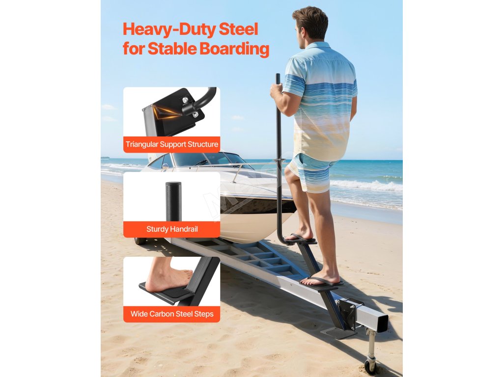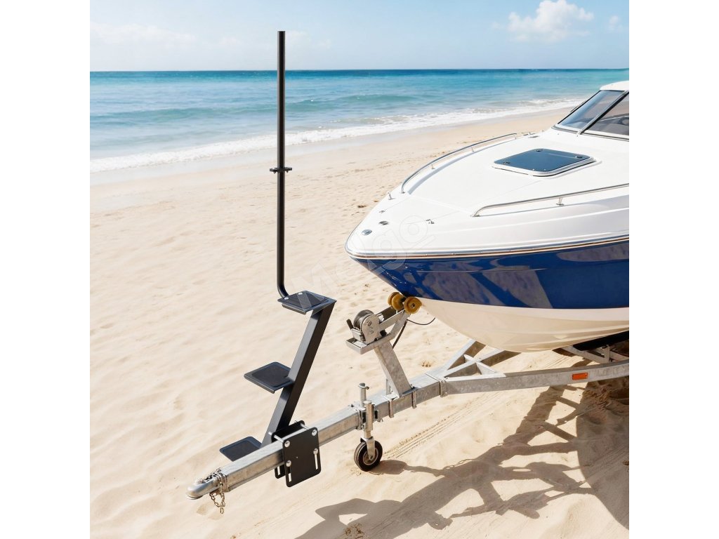 Naše schody na príves pre lode sú vyrobené z odolnej uhlíkovej ocele a majú trojuholníkovú nosnú konštrukciu pre stabilné zaťaženie. Povrch odolný proti korózii odoláva morskej vode, zatiaľ čo protiskluzová podložka zaisťuje istý krok. Nastaviteľný držiak sa hodí na 3 priečniky prívesu a je ľahko inštalovateľný.