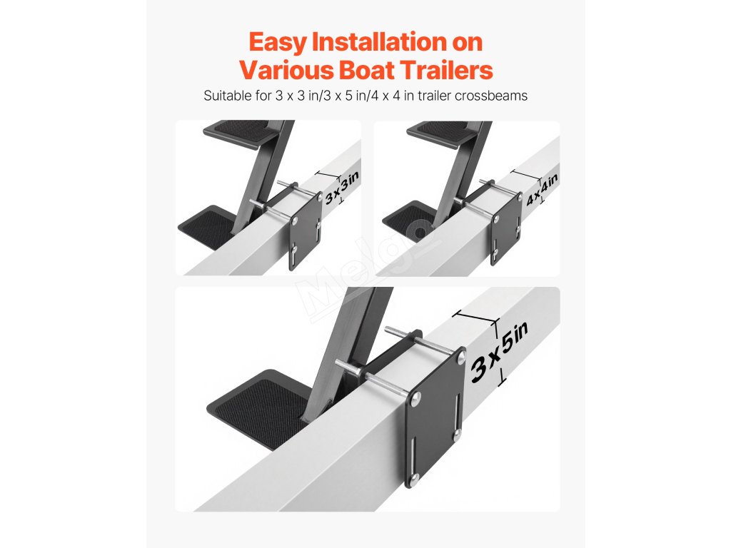 Základňa podporuje ľavú, strednú a pravú montážnu polohu a je kompatibilná s priečnymi nosníkmi prívesu s rozmermi 3 x 3 palce (76,2 x 76,2 mm), 3 x 5 palcov (76,2 x 127 mm) a 4 x 4 palce (101,6 x 101,6 mm). Schody na príves pre člny s madlom sa hodia na väčšinu bežných konfigurácií prívesov.