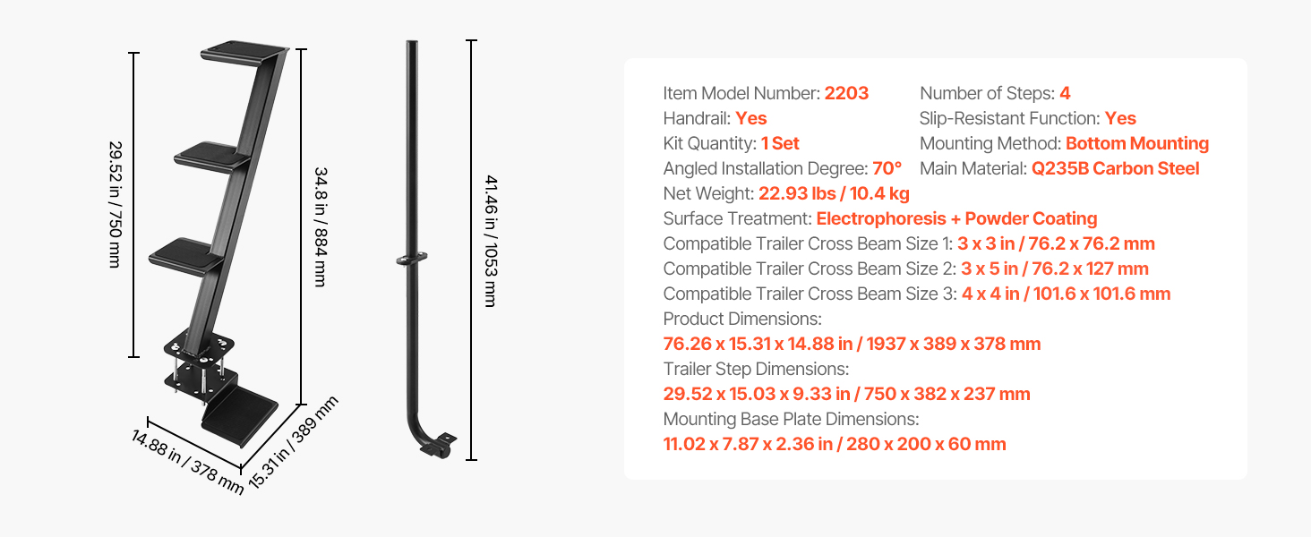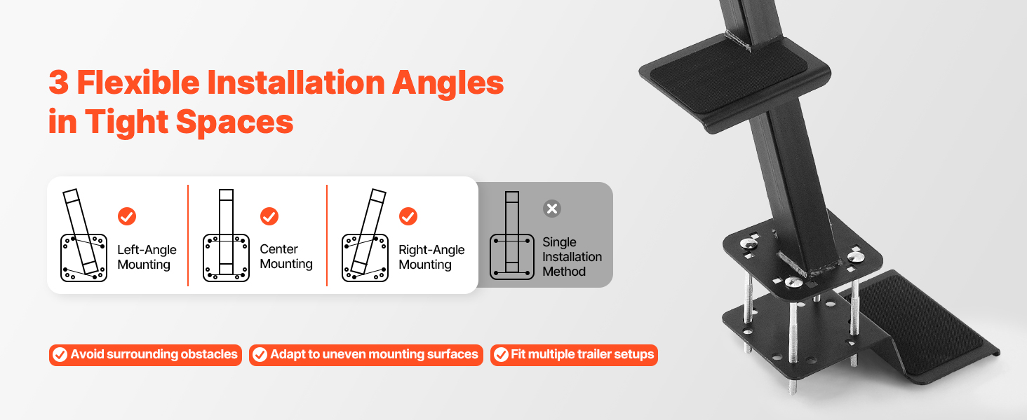 Základňa podporuje ľavú, strednú a pravú montážnu polohu a je kompatibilná s priečnymi nosníkmi prívesu s rozmermi 3 x 3 palce (76,2 x 76,2 mm), 3 x 5 palcov (76,2 x 127 mm) a 4 x 4 palce (101,6 x 101,6 mm). Schody na príves pre člny s madlom sa hodia na väčšinu bežných konfigurácií prívesov.