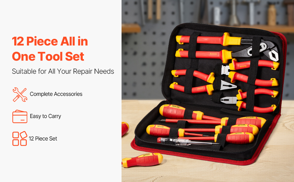 Toto izolované elektrické náradie obsahuje starostlivo vybraný sortiment náradia, ktorý je navrhnutý tak, aby spĺňal potreby profesionálnych aj každodenných domácich opráv.