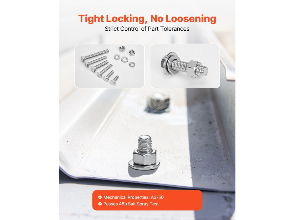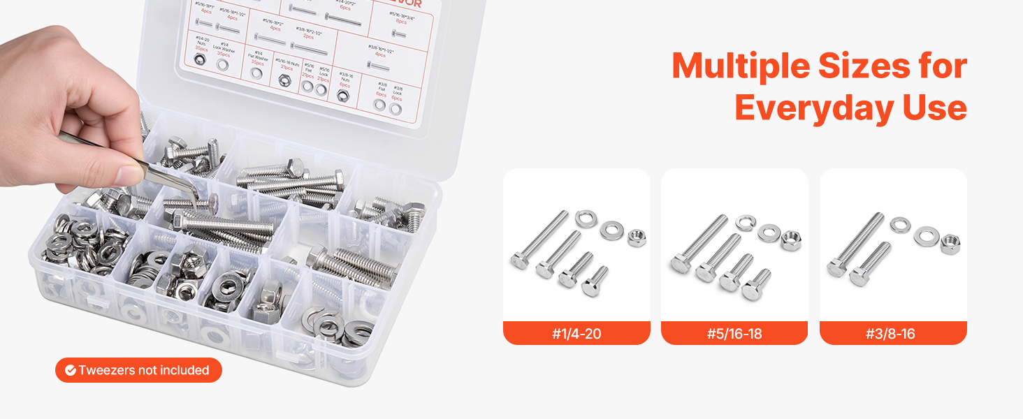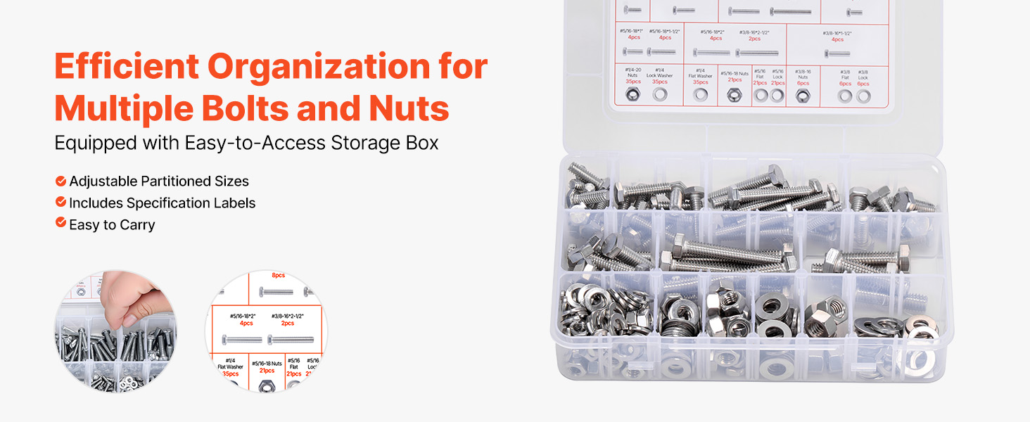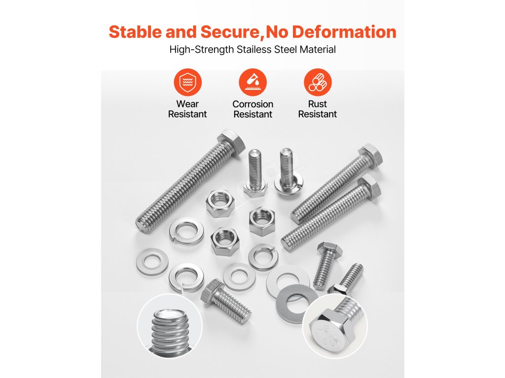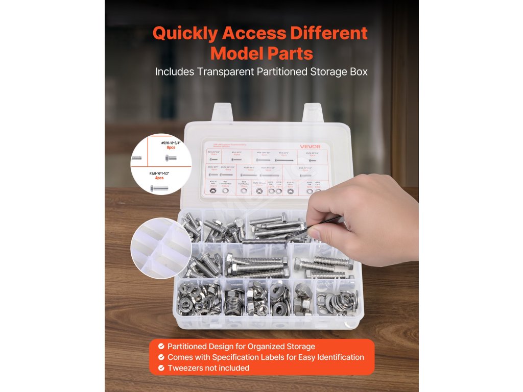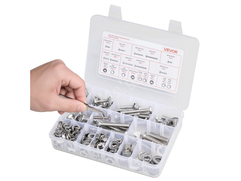 Vďaka širokému výberu skrutiek, matíc, podložiek a ďalších komponentov rôznych veľkostí táto súprava zabezpečuje pevné spoje pre rôzne materiály a uľahčuje nájdenie správnych dielov pre vaše úlohy.
