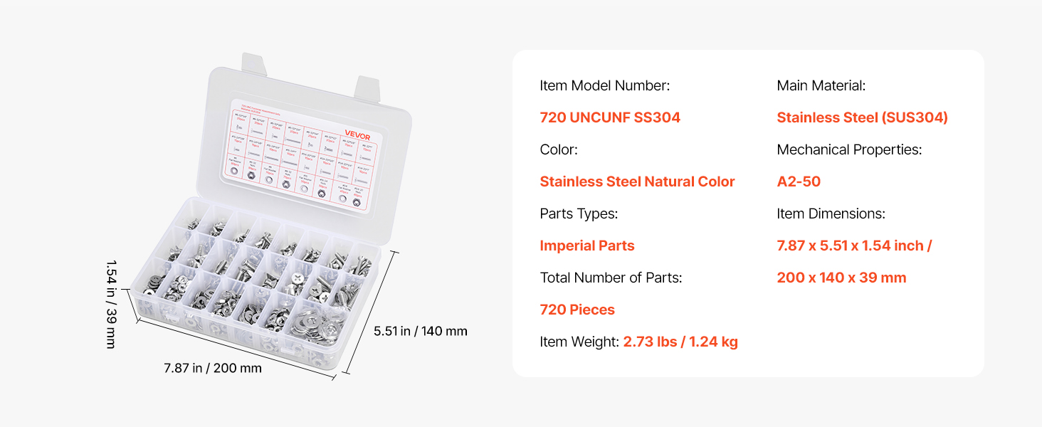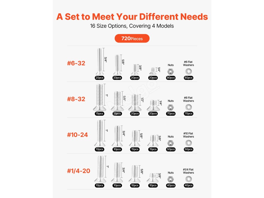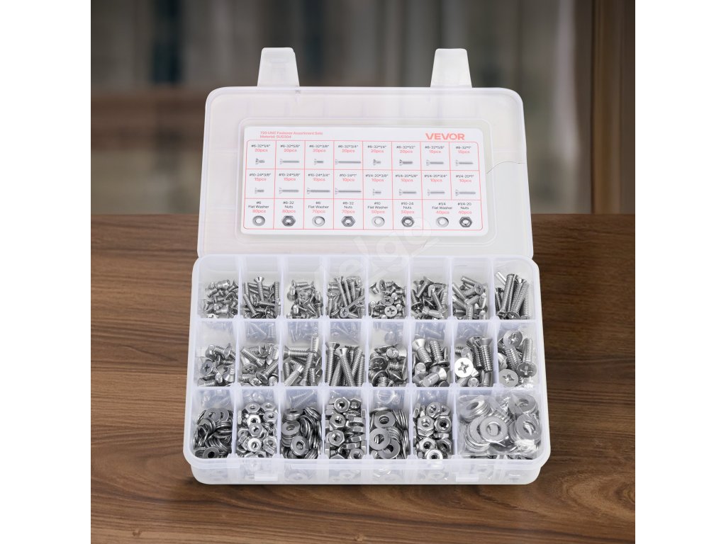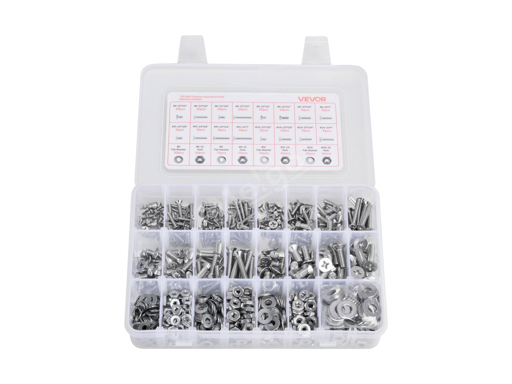 Sada skrutiek, matíc a podložiek 720 ks nerez 6-32 8-32 10-24 1/4-20