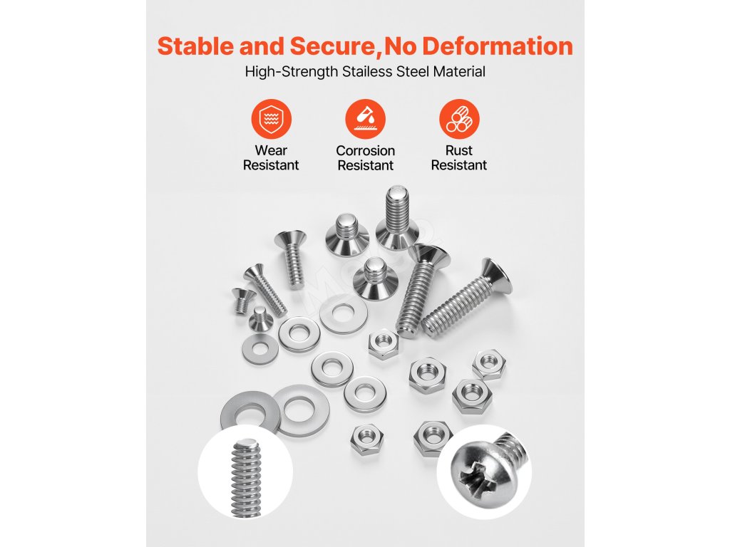 Vďaka širokému výberu skrutiek, matíc, podložiek a ďalších komponentov rôznych veľkostí táto súprava zabezpečuje pevné spoje pre rôzne materiály a uľahčuje nájdenie správnych dielov pre vaše úlohy.
