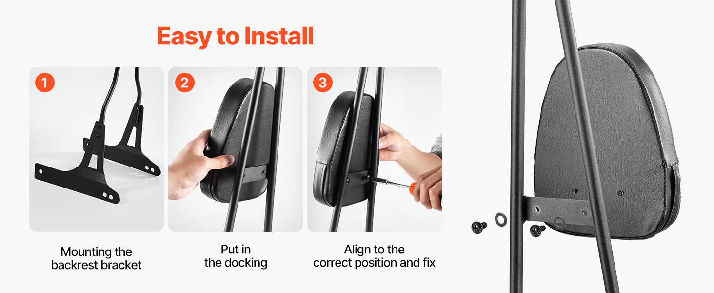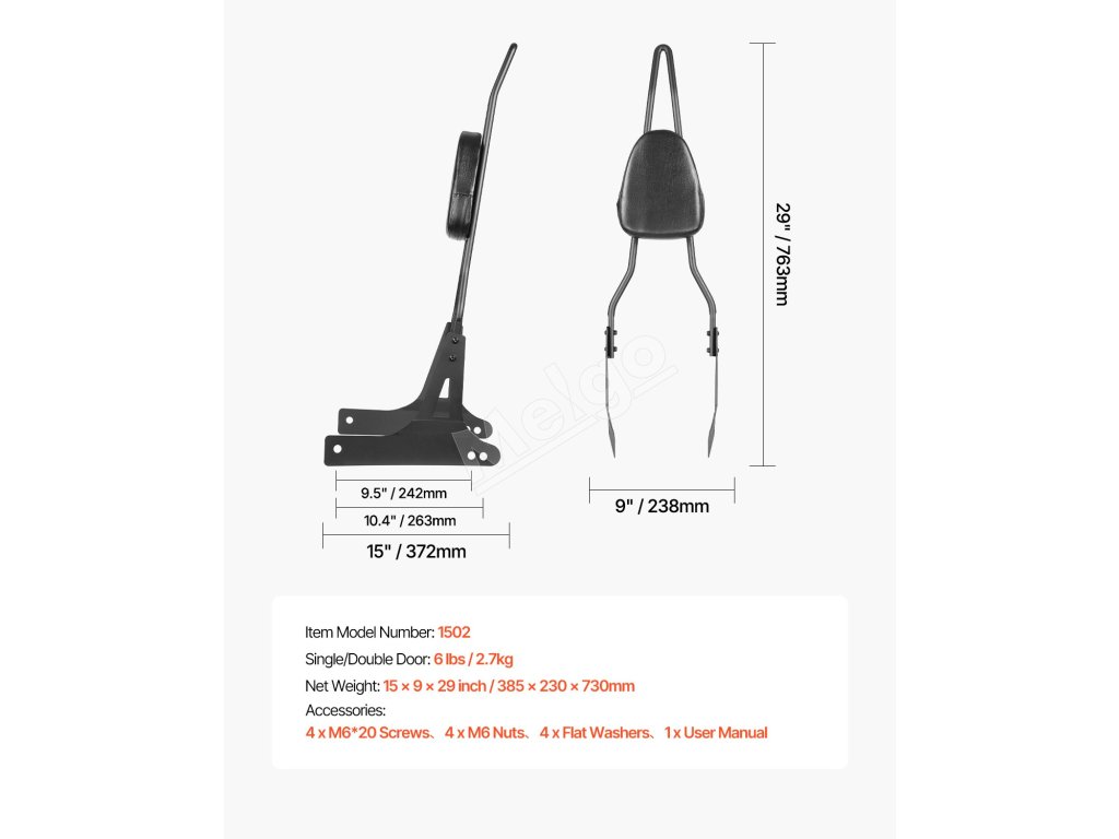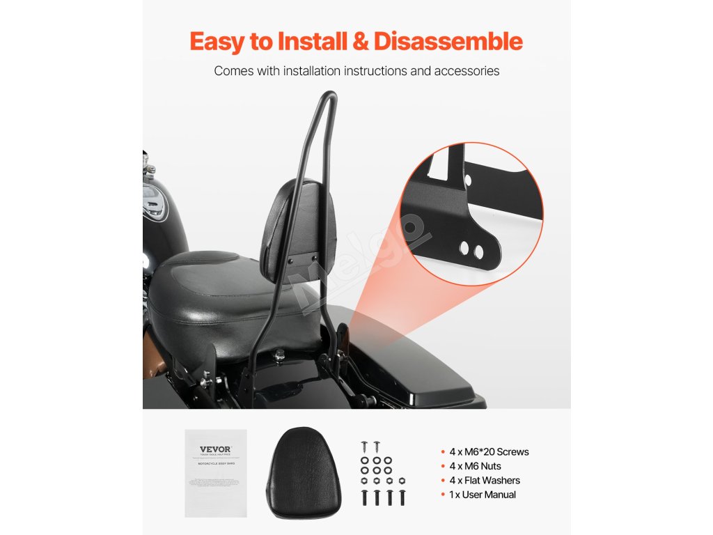 Tento motocyklový sissy bar je kompatibilný s motocyklami Harley, čo umožňuje rýchlu montáž a demontáž. Obsahuje podrobný návod na inštaláciu, ktorý zaručuje bezproblémové nastavenie v priebehu niekoľkých sekúnd.