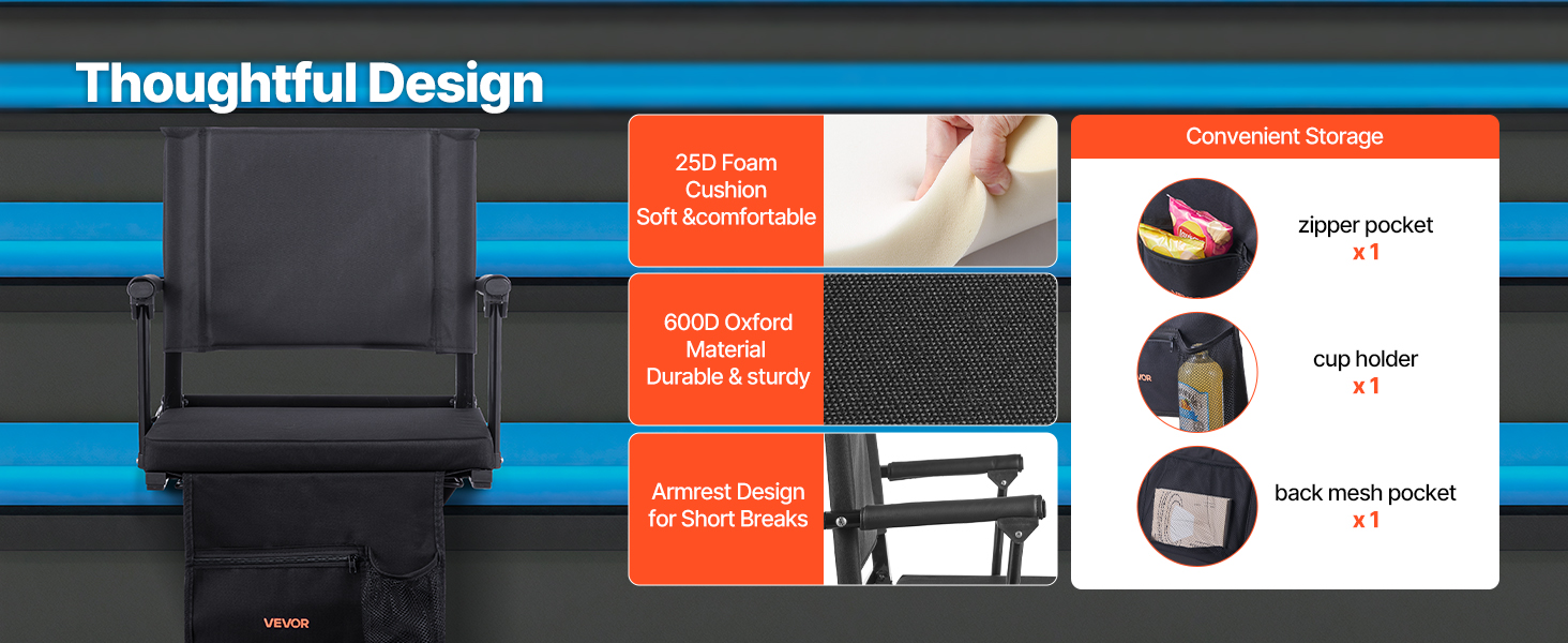 Vylepšite si zážitok z pobytu vonku s týmto sedadlom na tribúne s operadlom, ktoré je navrhnuté s niekoľkými úložnými vreckami na telefón, nápoje, občerstvenie a vreckovky. Zostavené z ľahkého oceľového rámu, peny s vysokou hustotou a vodoodolnej tkaniny 600D Oxford poskytuje odolnosť a pohodlné pohodlie.