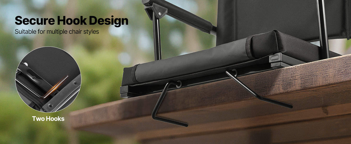 Toto sedadlo na štadión je vybavené dvoma skrytými háčikmi pod stoličkou, ktoré sa dajú v prípade potreby vytiahnuť a udržiavajú ho stabilné na tribúnach, lavičkách alebo rovných povrchoch. Užívajte si pohodlné sedenie a spoľahlivú oporu pri športových podujatiach, koncertoch alebo vonkajších aktivitách, nech už idete kamkoľvek.
