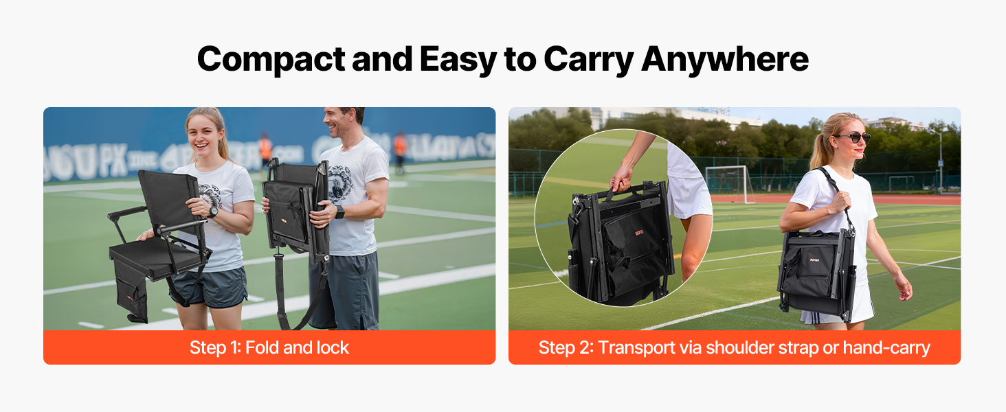 Toto štadiónové sedadlo s opierkou chrbta je navrhnuté na jednoduchú prepravu a obsahuje dva ramenné popruhy a bočné držadlo. Prenášajte ho na chrbte, aby ste si uvoľnili ruky, alebo uchopte ergonomickú bočnú rukoväť na rýchly prístup, čím si zaistíte pohodlie a komfort počas hier alebo vonkajších podujatí.