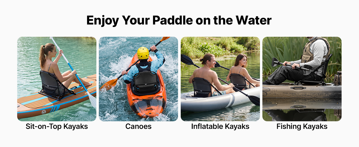 Vďaka systému inštalácie bez skrutiek a odolným nastaviteľným popruhom sa naše kajakové sedadlo dá bezpečne pripevniť na rôzne typy lodí. Hodí sa na väčšinu sit-on-top kajakov a rybárskych kajakov a je vhodné pre profesionálnych rybárov aj na ľahké plavby.