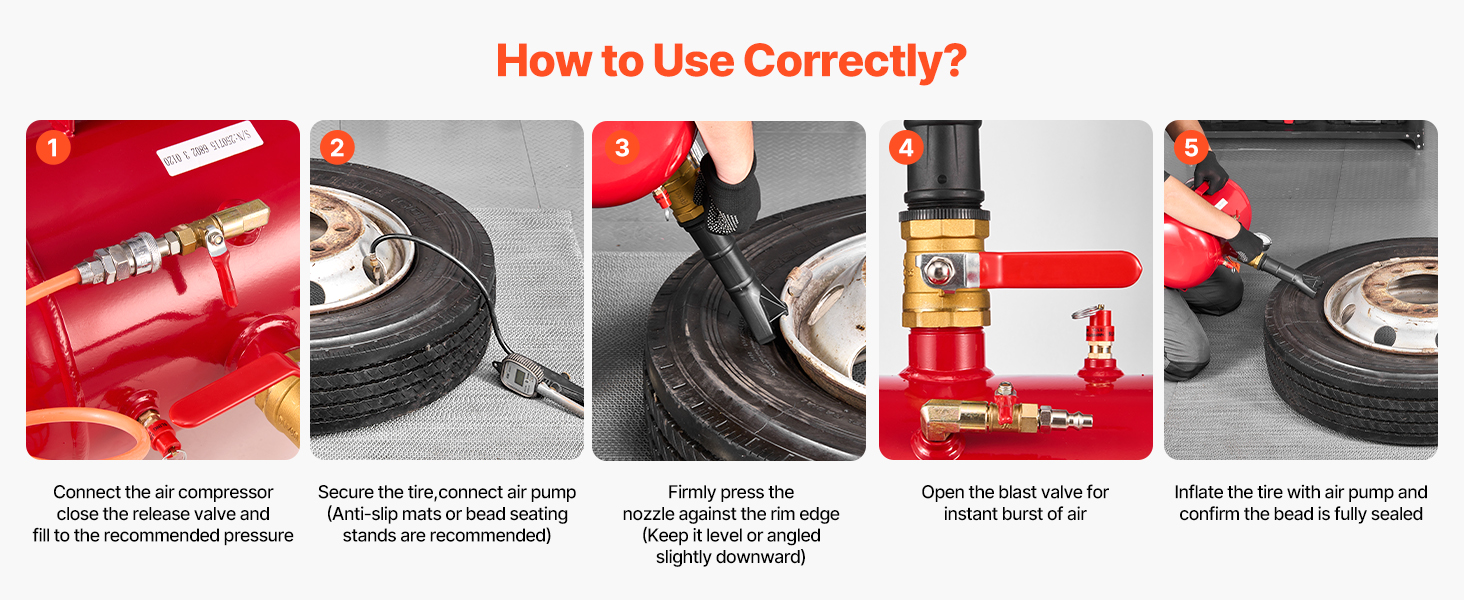 Naplňte fľašu vzduchovým kompresorom na pracovný tlak. Pneumatiku bezpečne umiestnite a zaistite jej stabilitu. Dýzu pevne pritlačte k okraju ráfika a otvorte ventil na hustenie. V prípade veľkých pneumatík použite na správne umiestnenie špeciálnu plošinu alebo kanál na usadzovanie pätiek.