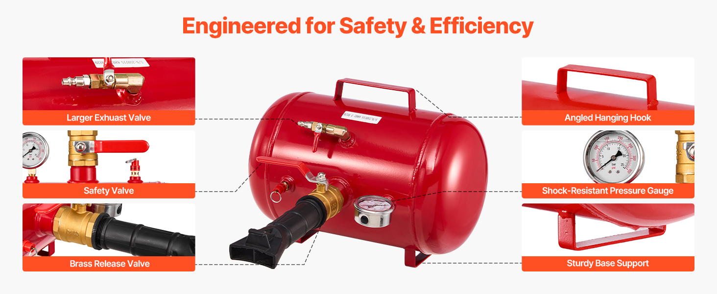 5 Gal / 18,9 l vysokotlakový hustilka rýchlo uvoľňuje vysokotlakový vzduch, čím sa pätka pneumatiky usadí v správnej polohe už za 1 sekundu a hustilka je tak rýchlejšie a jednoduchšie utesnená.