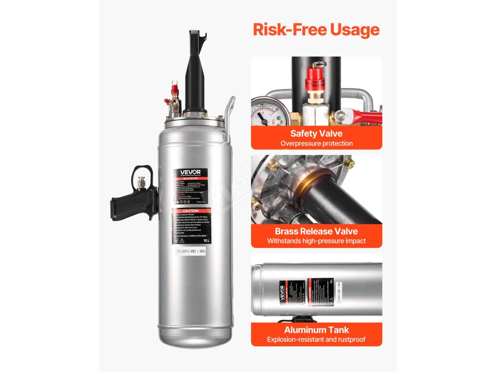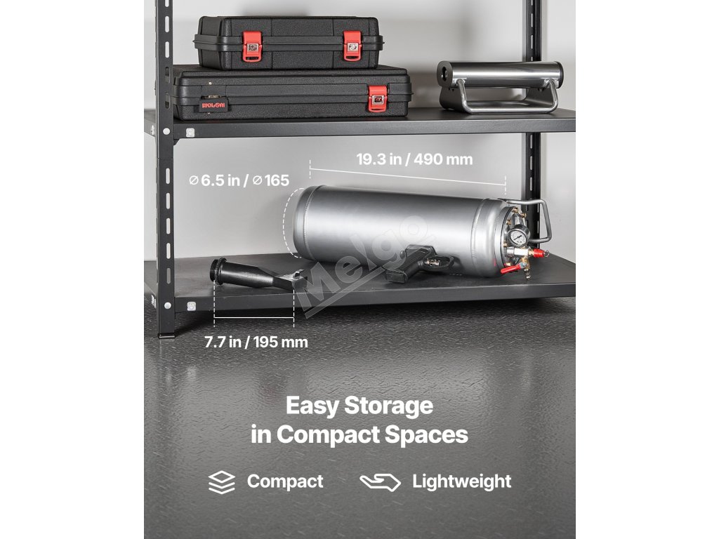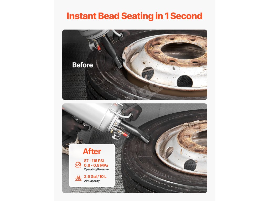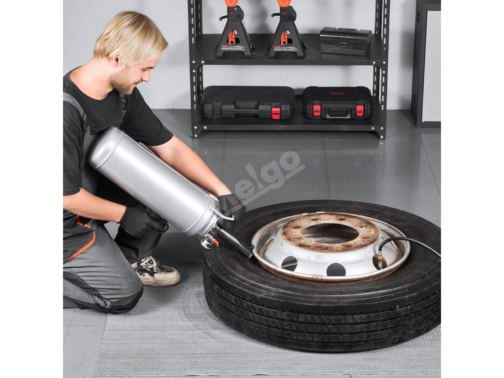 2.6 Gal / 10 L hustilka rýchlo uvoľňuje vysokotlakový vzduch, ktorý usadí pätku pneumatiky do správnej polohy len za 1 sekundu, vďaka čomu je hustenie pneumatík bezproblémové a šetrí prácu.