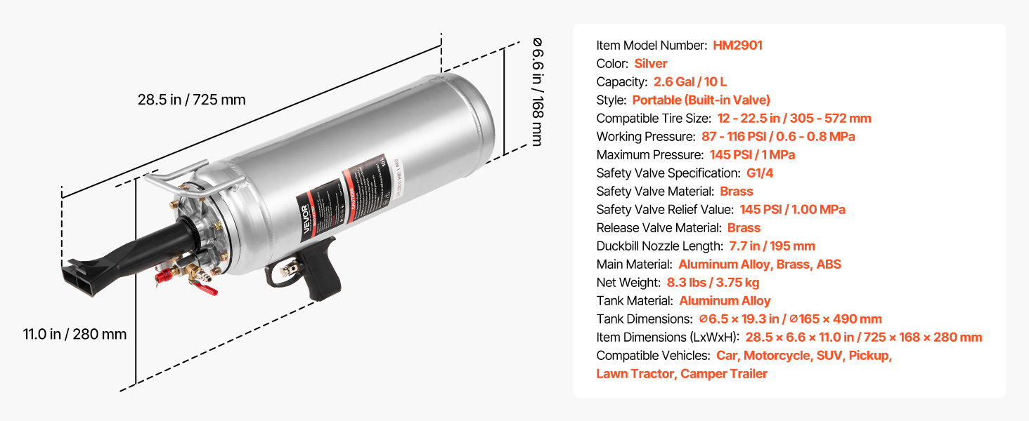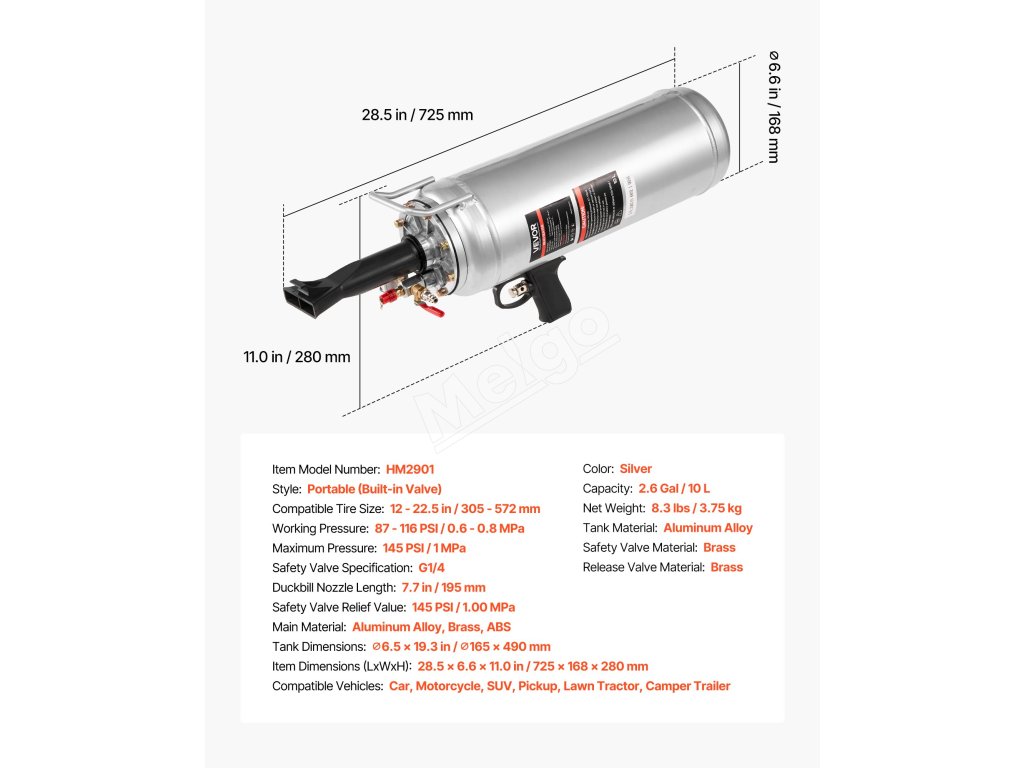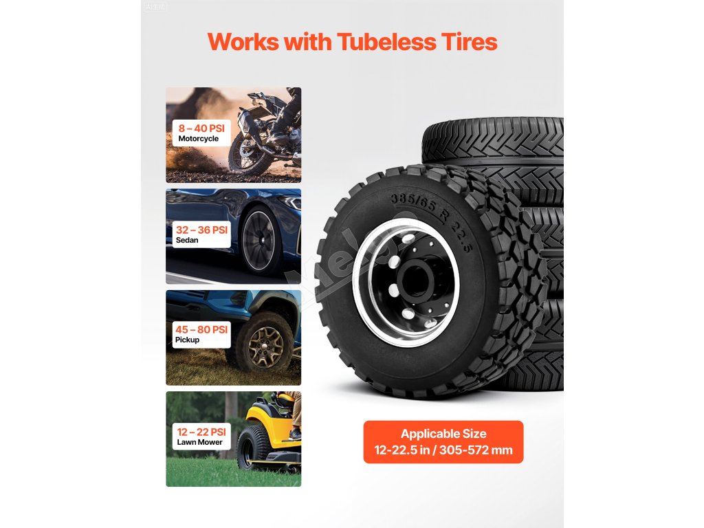 Podporuje bezdušové pneumatiky s priemerom 12-22,5 palca / 305-572 mm vrátane bežných vozidiel, ako sú osobné vozidlá, motocykle, SUV, pickupy, traktory na trávu a cestovné prívesy. Prevádzkový tlak: 87-116 PSI / 0,6-0,8 MPa. Hustotu vzduchu upravte podľa veľkosti pneumatiky.