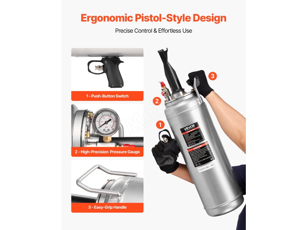 Naša pištoľová pištoľ zlepšuje úspešnosť nasadenia pätiek vďaka väčšiemu priemeru a rýchlejšiemu výfuku. Konce hadíc s prírubami zabezpečujú správny uhol od ráfika k pneumatike. Hadice s dvoma dýzami zvyšujú pokrytie prúdom vzduchu. Vybavený tlakomerom odolným voči nárazom na presné meranie.