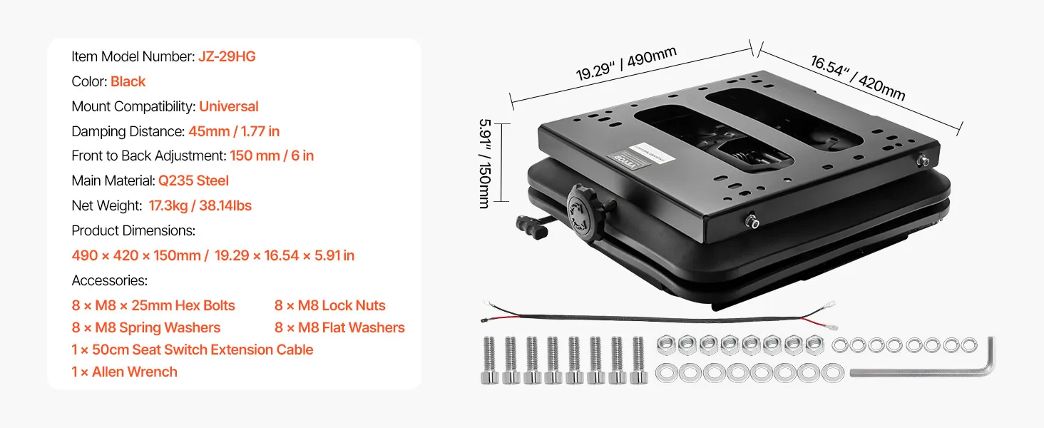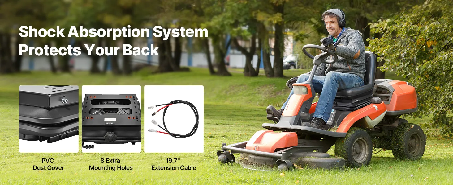 Táto súprava odpruženia vysokozdvižného vozíka podporuje 110,2-286,6 kg, má 1,77" zdvih tlmenia nárazov, čím účinne znižuje únavu chrbta a pása. Vďaka 8 montážnym otvorom je ideálna pre vysokozdvižné vozíky, kosačky na trávu atď. Vďaka 19,7-palcovému predlžovaciemu spínaciemu káblu je inštalácia flexibilná a rýchla.